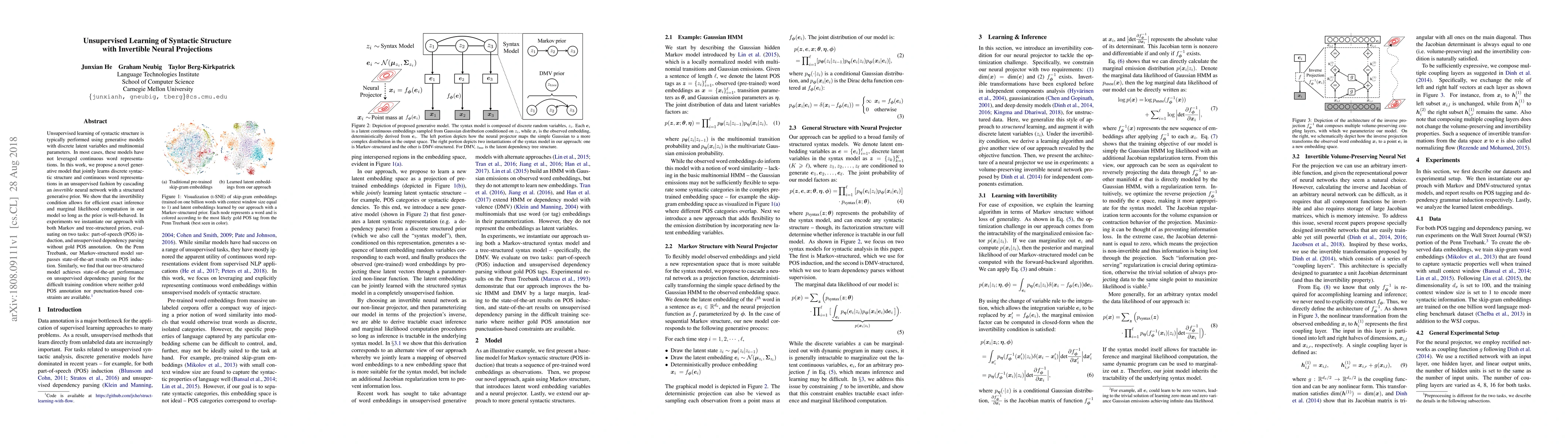 This paper proposes a novel generative model for unsupervised learning of syntactic structure using invertible neural networks and structured generative priors. The model achieves state-of-the-art results in part-of-speech induction and unsupervised dependency parsing, demonstrating the effectiveness of continuous word representations in syntactic learning.