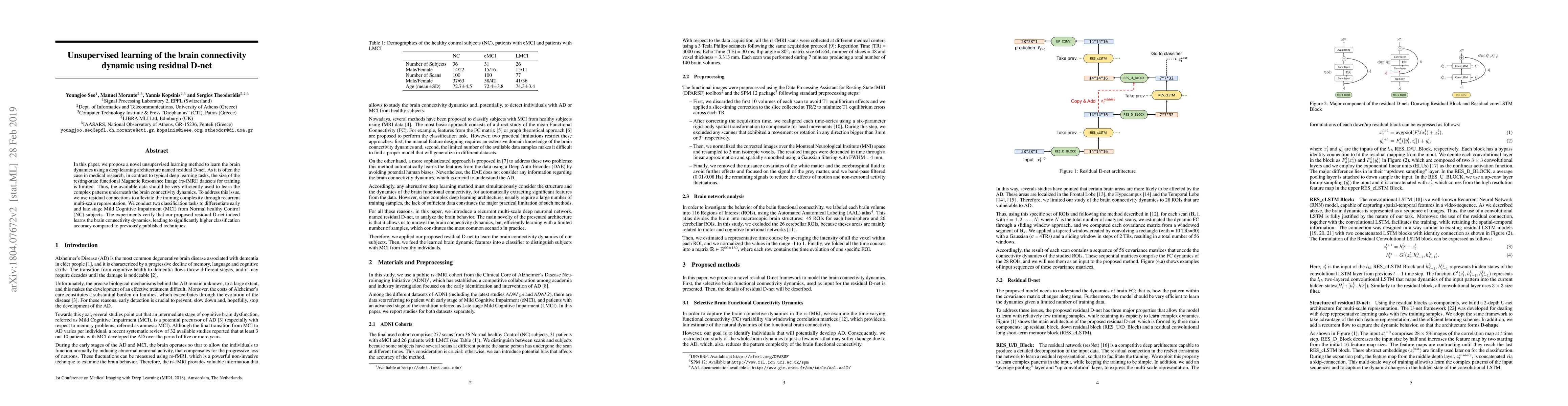 This paper introduces an unsupervised learning method using a residual D-net deep learning architecture to efficiently learn brain connectivity dynamics from limited rs-fMRI data. The proposed method leverages residual connections to enhance training efficiency and achieves higher classification accuracy in differentiating early and late stage MCI from NC subjects compared to existing techniques.