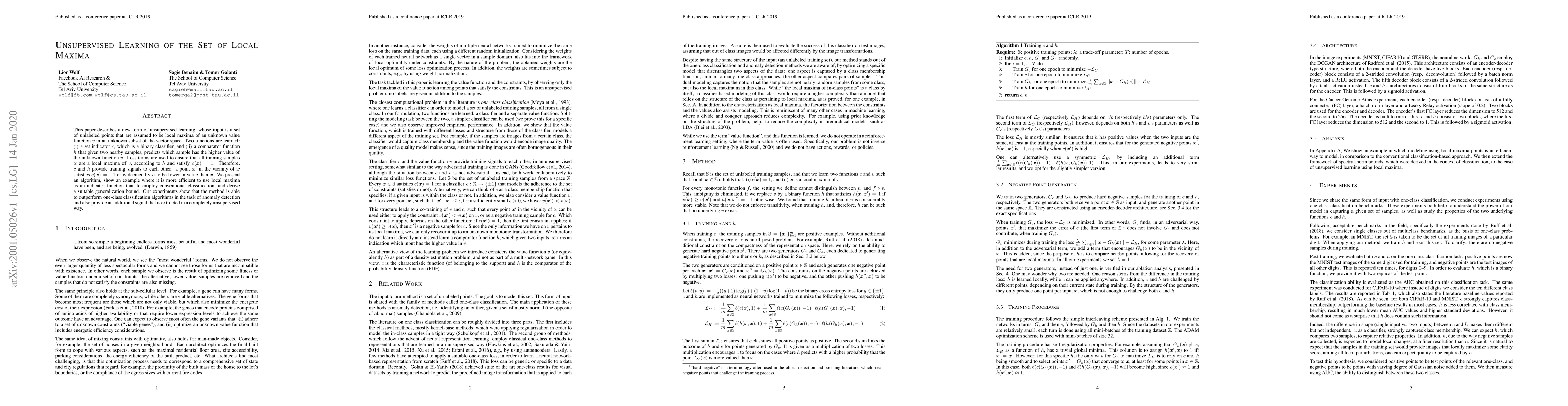 This paper describes a new form of unsupervised learning, whose input is a set of unlabeled points that are assumed to be local maxima of an unknown value function v in an unknown subset of the vector space. Two functions are learned: (i) a set indicator c, which is a binary classifier, and (ii) a comparator function h that given two nearby samples, predicts which sample has the higher value of the unknown function v. Loss terms are used to ensure that all training samples x are a local maxima of v, according to h and satisfy c(x)=1. Therefore, c and h provide training signals to each other: a point x' in the vicinity of x satisfies c(x)=-1 or is deemed by h to be lower in value than x. We present an algorithm, show an example where it is more efficient to use local maxima as an indicator function than to employ conventional classification, and derive a suitable generalization bound. Our experiments show that the method is able to outperform one-class classification algorithms in the task of anomaly detection and also provide an additional signal that is extracted in a completely unsupervised way.