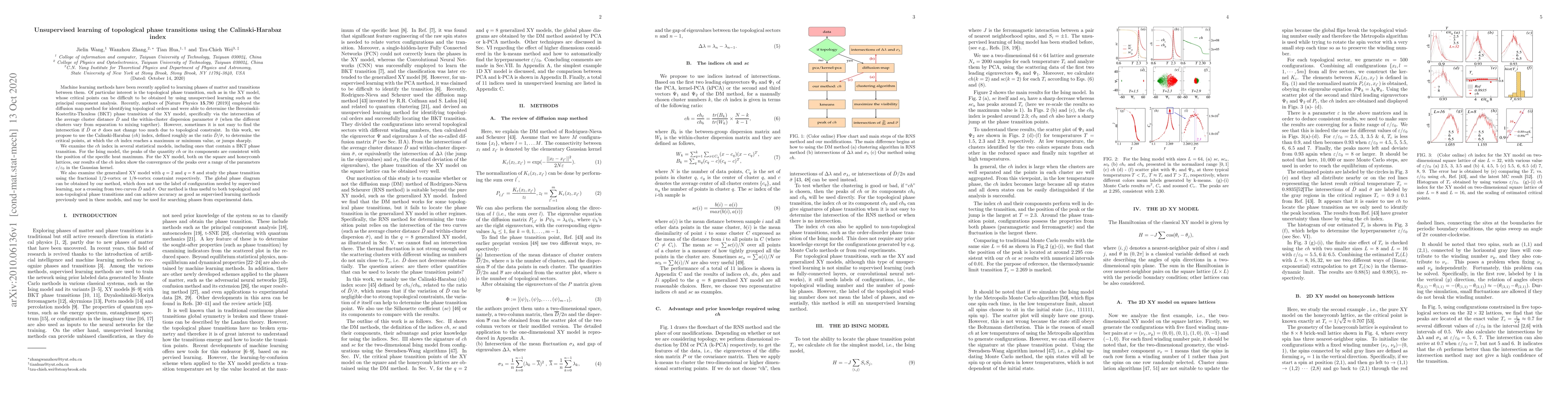 Machine learning methods have been recently applied to learning phases of matter and transitions between them. Of particular interest is the topological phase transition, such as in the XY model, which can be difficult for unsupervised learning such as the principal component analysis. Recently, authors of [Nature Physics \textbf{15},790 (2019)] employed the diffusion-map method for identifying topological order and were able to determine the BKT phase transition of the XY model, specifically via the intersection of the average cluster distance $\bar{D}$ and the within cluster dispersion $\bar\sigma$ (when the different clusters vary from separation to mixing together). However, sometimes it is not easy to find the intersection if $\bar{D}$ or $\bar{\sigma}$ does not change too much due to topological constraint. In this paper, we propose to use the Calinski-Harabaz ($ch$) index, defined roughly as the ratio $\bar D/\bar \sigma$, to determine the critical points, at which the $ch$ index reaches a maximum or minimum value, or jump sharply. We examine the $ch$ index in several statistical models, including ones that contain a BKT phase transition. For the Ising model, the peaks of the quantity $ch$ or its components are consistent with the position of the specific heat maximum. For the XY model both on the square lattices and honeycomb lattices, our results of the $ch$ index show the convergence of the peaks over a range of the parameters $\varepsilon/\varepsilon_0$ in the Gaussian kernel. We also examine the generalized XY model with $q=2$ and $q=8$ and at the value away from the pure XY limit. Our method is thus useful to both topological and non-topological phase transitions and can achieve accuracy as good as supervised learning methods previously used in these models, and may be used for searching phases from experimental data.