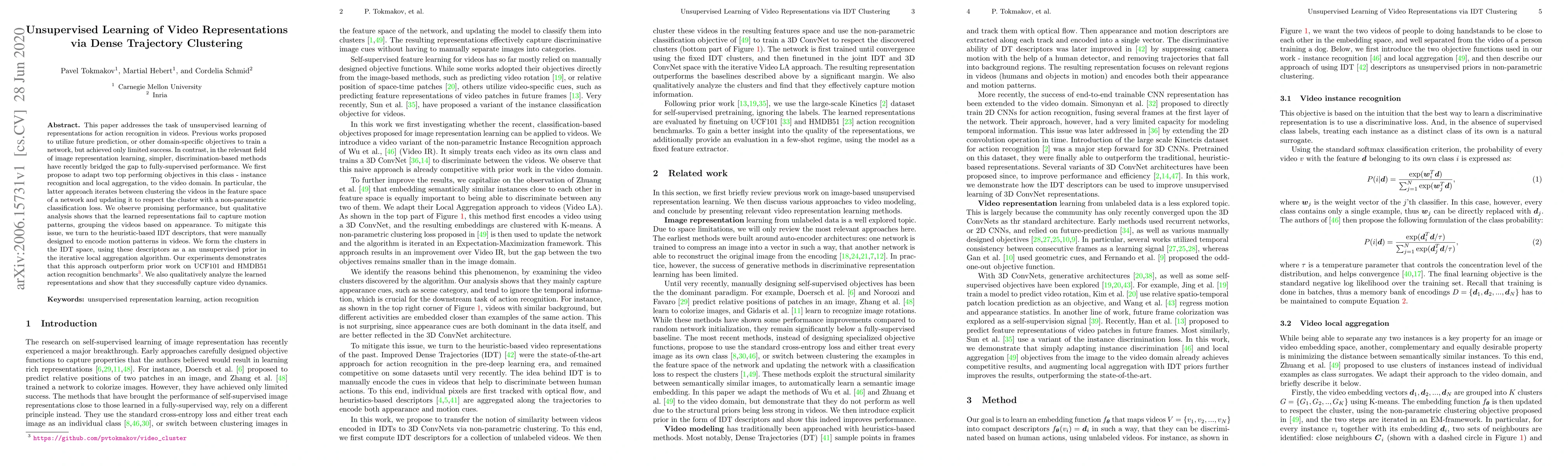 This paper addresses the task of unsupervised learning of representations for action recognition in videos. Previous works proposed to utilize future prediction, or other domain-specific objectives to train a network, but achieved only limited success. In contrast, in the relevant field of image representation learning, simpler, discrimination-based methods have recently bridged the gap to fully-supervised performance. We first propose to adapt two top performing objectives in this class - instance recognition and local aggregation, to the video domain. In particular, the latter approach iterates between clustering the videos in the feature space of a network and updating it to respect the cluster with a non-parametric classification loss. We observe promising performance, but qualitative analysis shows that the learned representations fail to capture motion patterns, grouping the videos based on appearance. To mitigate this issue, we turn to the heuristic-based IDT descriptors, that were manually designed to encode motion patterns in videos. We form the clusters in the IDT space, using these descriptors as a an unsupervised prior in the iterative local aggregation algorithm. Our experiments demonstrates that this approach outperform prior work on UCF101 and HMDB51 action recognition benchmarks. We also qualitatively analyze the learned representations and show that they successfully capture video dynamics.