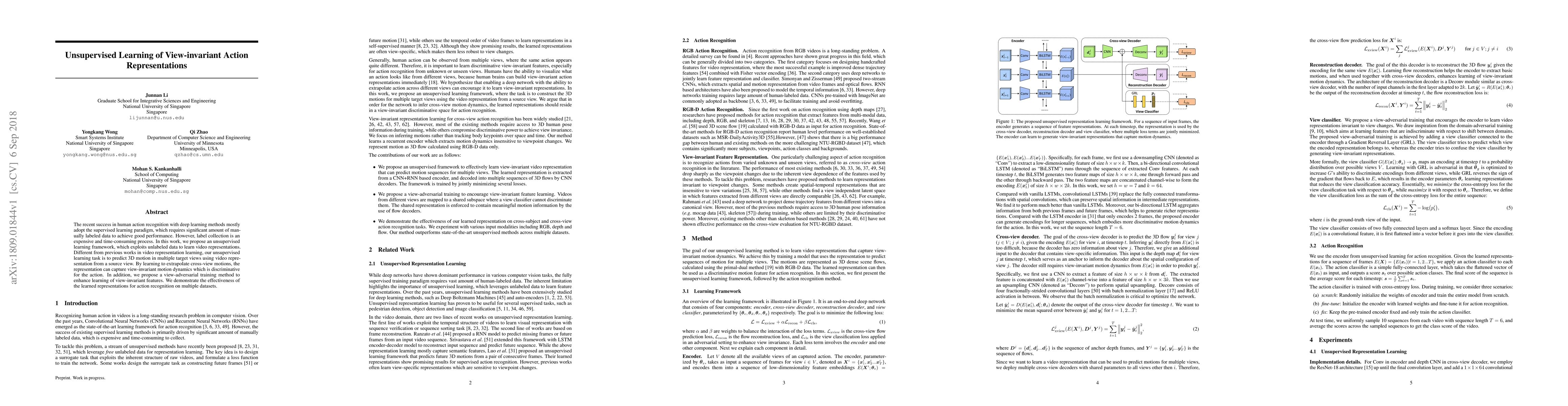 This paper proposes an unsupervised learning framework to develop view-invariant action representations using unlabeled video data. It predicts 3D motion in target views from a source view to capture discriminative, view-invariant motion dynamics, and employs view-adversarial training to enhance this learning, demonstrating effectiveness for action recognition.