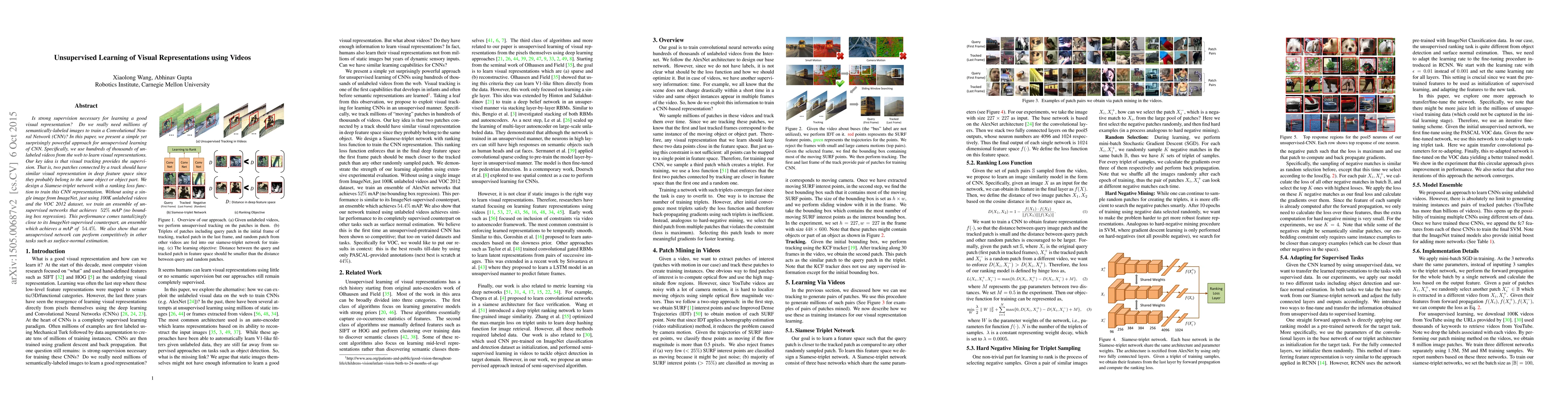 This paper proposes an unsupervised learning method for CNNs using unlabeled videos, leveraging visual tracking as a form of supervision. The approach trains an ensemble of networks that achieves nearly as high performance as a supervised ImageNet-trained model, demonstrating the potential of self-supervised learning for visual representations.