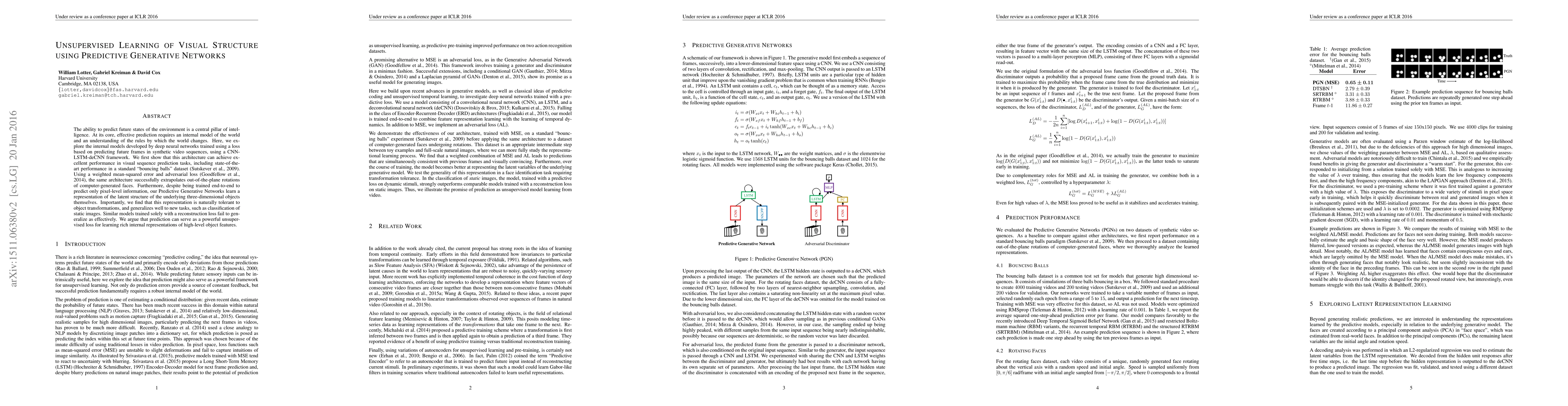 The ability to predict future states of the environment is a central pillar of intelligence. At its core, effective prediction requires an internal model of the world and an understanding of the rules by which the world changes. Here, we explore the internal models developed by deep neural networks trained using a loss based on predicting future frames in synthetic video sequences, using a CNN-LSTM-deCNN framework. We first show that this architecture can achieve excellent performance in visual sequence prediction tasks, including state-of-the-art performance in a standard 'bouncing balls' dataset (Sutskever et al., 2009). Using a weighted mean-squared error and adversarial loss (Goodfellow et al., 2014), the same architecture successfully extrapolates out-of-the-plane rotations of computer-generated faces. Furthermore, despite being trained end-to-end to predict only pixel-level information, our Predictive Generative Networks learn a representation of the latent structure of the underlying three-dimensional objects themselves. Importantly, we find that this representation is naturally tolerant to object transformations, and generalizes well to new tasks, such as classification of static images. Similar models trained solely with a reconstruction loss fail to generalize as effectively. We argue that prediction can serve as a powerful unsupervised loss for learning rich internal representations of high-level object features.