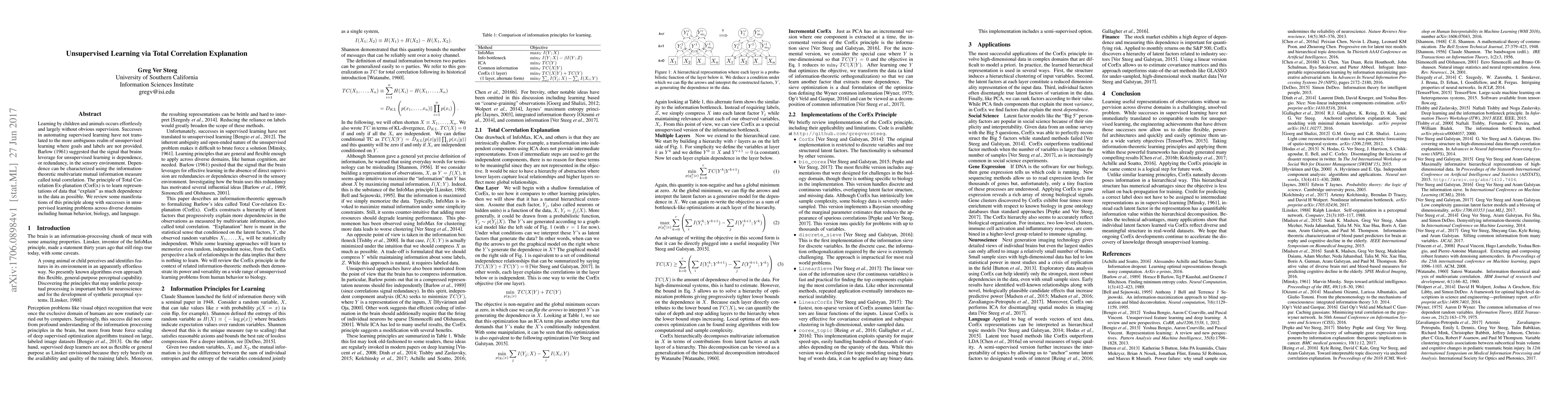 Learning by children and animals occurs effortlessly and largely without obvious supervision. Successes in automating supervised learning have not translated to the more ambiguous realm of unsupervised learning where goals and labels are not provided. Barlow (1961) suggested that the signal that brains leverage for unsupervised learning is dependence, or redundancy, in the sensory environment. Dependence can be characterized using the information-theoretic multivariate mutual information measure called total correlation. The principle of Total Cor-relation Ex-planation (CorEx) is to learn representations of data that "explain" as much dependence in the data as possible. We review some manifestations of this principle along with successes in unsupervised learning problems across diverse domains including human behavior, biology, and language.