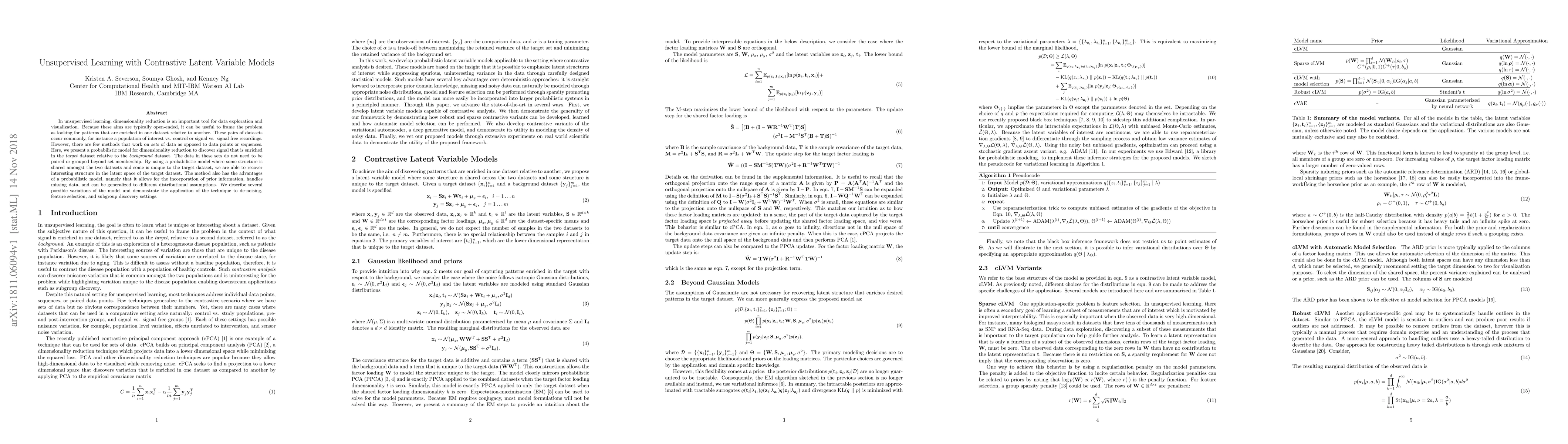 This paper presents a probabilistic model for unsupervised learning that discovers enriched signal in target datasets compared to background datasets. It offers advantages like incorporating prior information, handling missing data, and generalizability across different distributional assumptions.