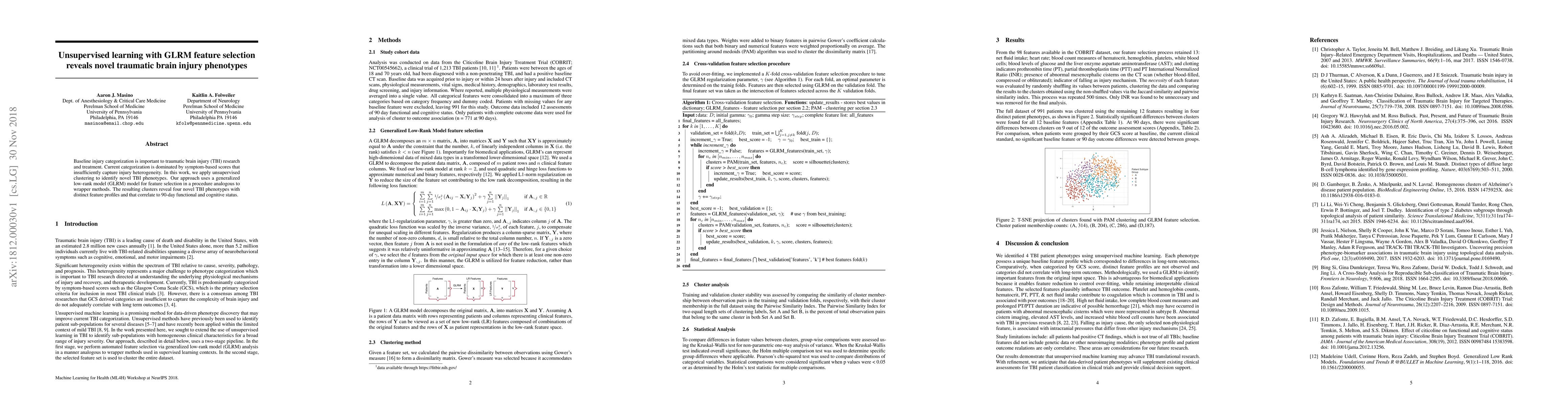 This study employs unsupervised learning with GLRM feature selection to identify novel traumatic brain injury (TBI) phenotypes, revealing four distinct clusters that correlate with 90-day functional and cognitive outcomes, offering a more nuanced categorization than symptom-based scores.