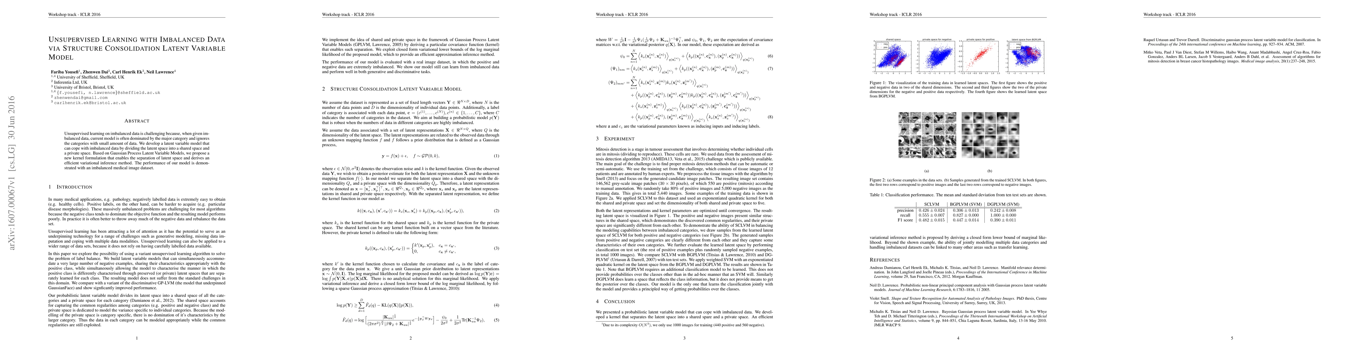 Unsupervised learning on imbalanced data is challenging because, when given imbalanced data, current model is often dominated by the major category and ignores the categories with small amount of data. We develop a latent variable model that can cope with imbalanced data by dividing the latent space into a shared space and a private space. Based on Gaussian Process Latent Variable Models, we propose a new kernel formulation that enables the separation of latent space and derives an efficient variational inference method. The performance of our model is demonstrated with an imbalanced medical image dataset.