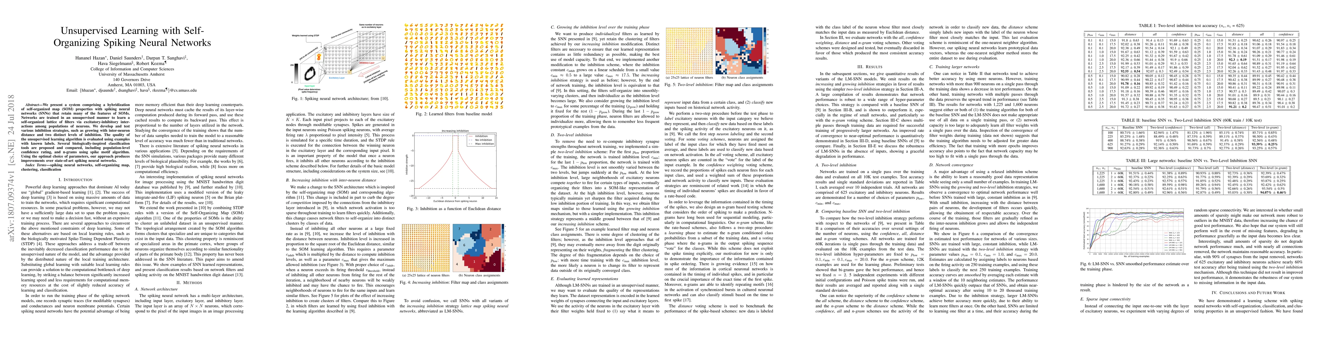 This paper introduces a self-organizing spiking neural network combining self-organized map properties with unsupervised learning. The network employs excitatory-inhibitory interactions to form a lattice of filters, evaluated against labeled examples, and demonstrates superior performance compared to existing methods.