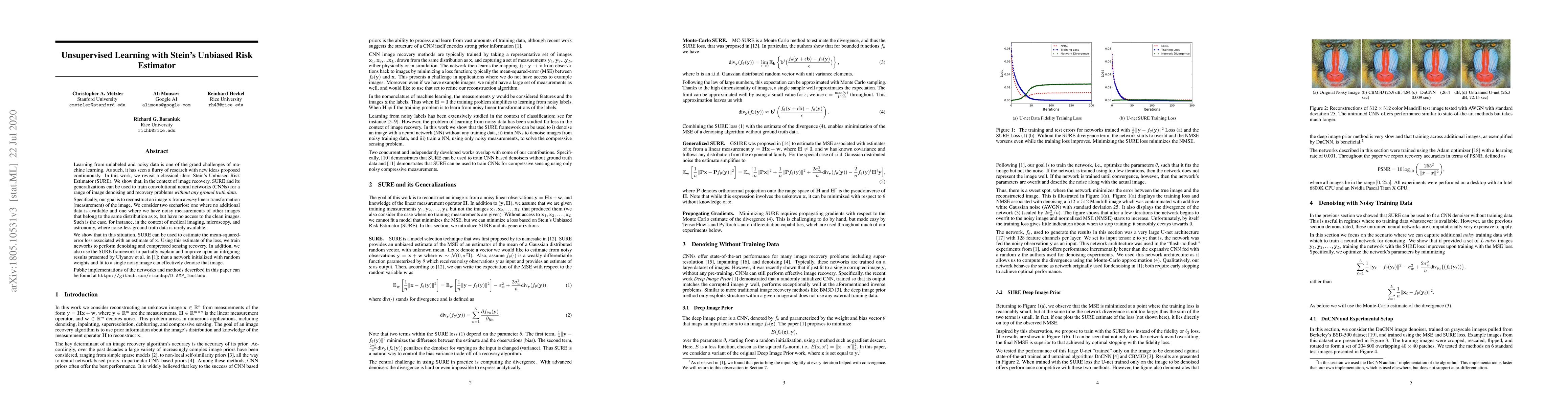 Learning from unlabeled and noisy data is one of the grand challenges of machine learning. As such, it has seen a flurry of research with new ideas proposed continuously. In this work, we revisit a classical idea: Stein's Unbiased Risk Estimator (SURE). We show that, in the context of image recovery, SURE and its generalizations can be used to train convolutional neural networks (CNNs) for a range of image denoising and recovery problems without any ground truth data. Specifically, our goal is to reconstruct an image $x$ from a noisy linear transformation (measurement) of the image. We consider two scenarios: one where no additional data is available and one where we have measurements of other images that are drawn from the same noisy distribution as $x$, but have no access to the clean images. Such is the case, for instance, in the context of medical imaging, microscopy, and astronomy, where noise-less ground truth data is rarely available. We show that in this situation, SURE can be used to estimate the mean-squared-error loss associated with an estimate of $x$. Using this estimate of the loss, we train networks to perform denoising and compressed sensing recovery. In addition, we also use the SURE framework to partially explain and improve upon an intriguing results presented by Ulyanov et al. in "Deep Image Prior": that a network initialized with random weights and fit to a single noisy image can effectively denoise that image. Public implementations of the networks and methods described in this paper can be found at https://github.com/ricedsp/D-AMP_Toolbox.