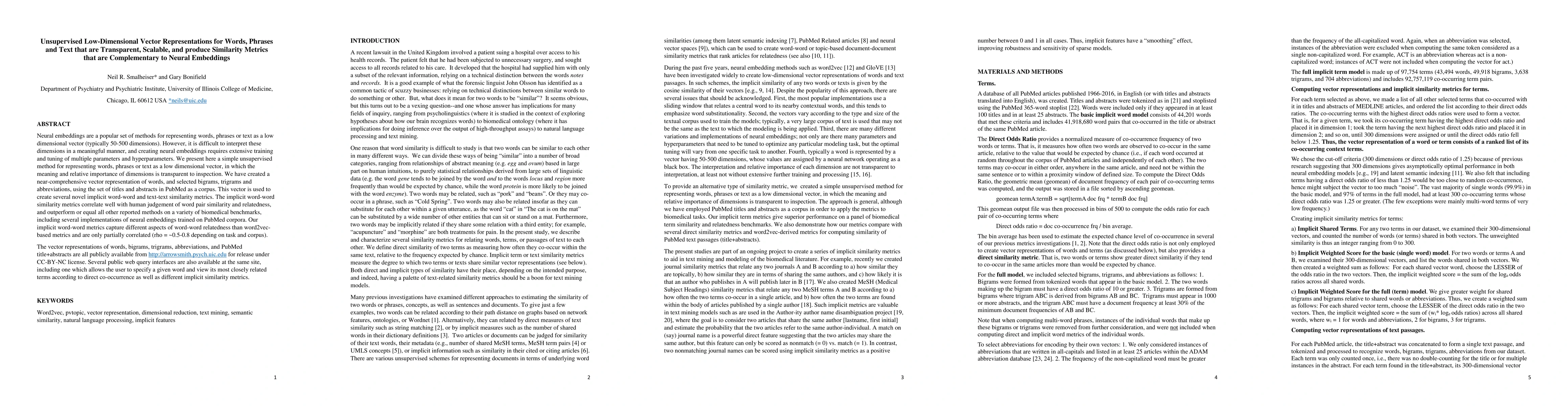 Neural embeddings are a popular set of methods for representing words, phrases or text as a low dimensional vector (typically 50-500 dimensions). However, it is difficult to interpret these dimensions in a meaningful manner, and creating neural embeddings requires extensive training and tuning of multiple parameters and hyperparameters. We present here a simple unsupervised method for representing words, phrases or text as a low dimensional vector, in which the meaning and relative importance of dimensions is transparent to inspection. We have created a near-comprehensive vector representation of words, and selected bigrams, trigrams and abbreviations, using the set of titles and abstracts in PubMed as a corpus. This vector is used to create several novel implicit word-word and text-text similarity metrics. The implicit word-word similarity metrics correlate well with human judgement of word pair similarity and relatedness, and outperform or equal all other reported methods on a variety of biomedical benchmarks, including several implementations of neural embeddings trained on PubMed corpora. Our implicit word-word metrics capture different aspects of word-word relatedness than word2vec-based metrics and are only partially correlated (rho = ~0.5-0.8 depending on task and corpus). The vector representations of words, bigrams, trigrams, abbreviations, and PubMed title+abstracts are all publicly available from http://arrowsmith.psych.uic.edu for release under CC-BY-NC license. Several public web query interfaces are also available at the same site, including one which allows the user to specify a given word and view its most closely related terms according to direct co-occurrence as well as different implicit similarity metrics.