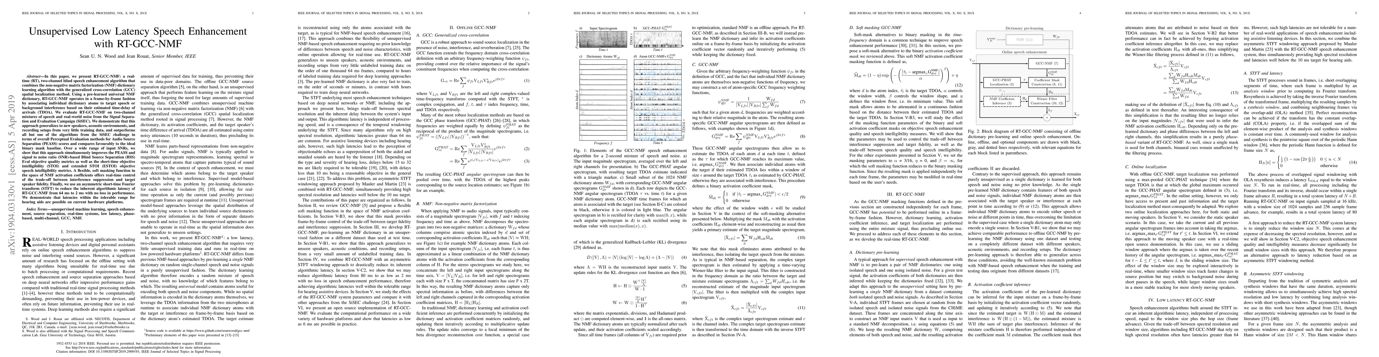 In this paper, we present RT-GCC-NMF: a real-time (RT), two-channel blind speech enhancement algorithm that combines the non-negative matrix factorization (NMF) dictionary learning algorithm with the generalized cross-correlation (GCC) spatial localization method. Using a pre-learned universal NMF dictionary, RT-GCC-NMF operates in a frame-by-frame fashion by associating individual dictionary atoms to target speech or background interference based on their estimated time-delay of arrivals (TDOA). We evaluate RT-GCC-NMF on two-channel mixtures of speech and real-world noise from the Signal Separation and Evaluation Campaign (SiSEC). We demonstrate that this approach generalizes to new speakers, acoustic environments, and recording setups from very little training data, and outperforms all but one of the algorithms from the SiSEC challenge in terms of overall Perceptual Evaluation methods for Audio Source Separation (PEASS) scores and compares favourably to the ideal binary mask baseline. Over a wide range of input SNRs, we show that this approach simultaneously improves the PEASS and signal to noise ratio (SNR)-based Blind Source Separation (BSS) Eval objective quality metrics as well as the short-time objective intelligibility (STOI) and extended STOI (ESTOI) objective speech intelligibility metrics. A flexible, soft masking function in the space of NMF activation coefficients offers real-time control of the trade-off between interference suppression and target speaker fidelity. Finally, we use an asymmetric short-time Fourier transform (STFT) to reduce the inherent algorithmic latency of RT-GCC-NMF from 64 ms to 2 ms with no loss in performance. We demonstrate that latencies within the tolerable range for hearing aids are possible on current hardware platforms.