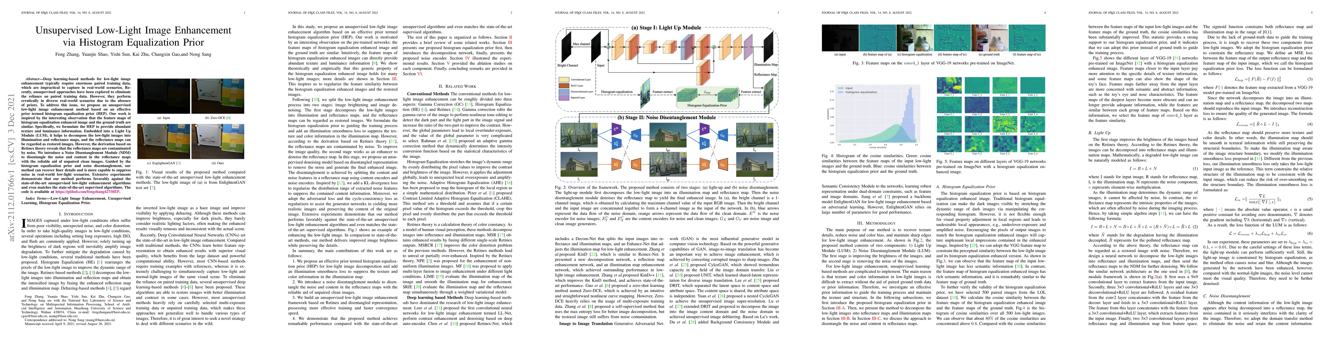 This paper proposes an unsupervised low-light image enhancement method using a histogram equalization prior to provide texture and luminance information, and a Noise Disentanglement Module to separate noise from content, achieving competitive results against both unsupervised and supervised methods.