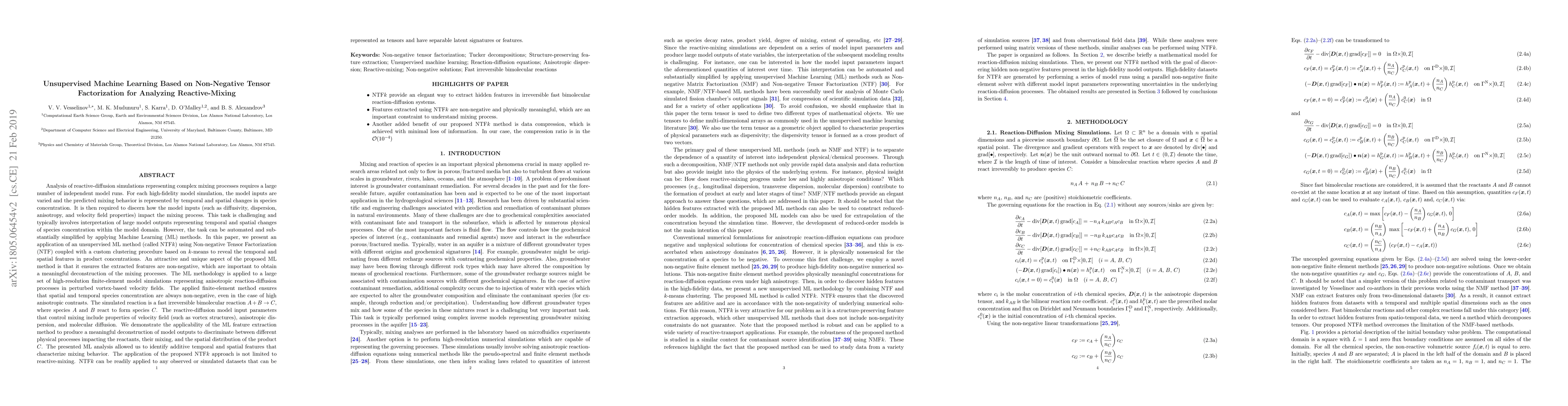 Analysis of reactive-diffusion simulations requires a large number of independent model runs. For each high-fidelity simulation, inputs are varied and the predicted mixing behavior is represented by changes in species concentration. It is then required to discern how the model inputs impact the mixing process. This task is challenging and typically involves interpretation of large model outputs. However, the task can be automated and substantially simplified by applying Machine Learning (ML) methods. In this paper, we present an application of an unsupervised ML method (called NTFk) using Non-negative Tensor Factorization (NTF) coupled with a custom clustering procedure based on k-means to reveal hidden features in product concentration. An attractive aspect of the proposed ML method is that it ensures the extracted features are non-negative, which are important to obtain a meaningful deconstruction of the mixing processes. The ML method is applied to a large set of high-resolution FEM simulations representing reaction-diffusion processes in perturbed vortex-based velocity fields. The applied FEM ensures that species concentration are always non-negative. The simulated reaction is a fast irreversible bimolecular reaction. The reactive-diffusion model input parameters that control mixing include properties of velocity field, anisotropic dispersion, and molecular diffusion. We demonstrate the applicability of the ML method to produce a meaningful deconstruction of model outputs to discriminate between different physical processes impacting the reactants, their mixing, and the spatial distribution of the product. The presented ML analysis allowed us to identify additive features that characterize mixing behavior.