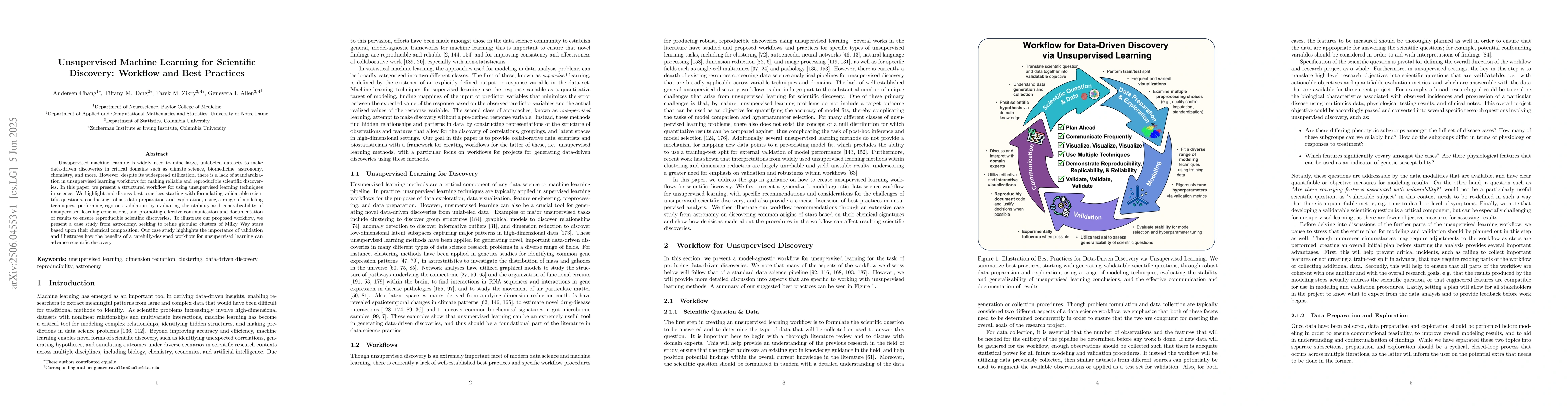 This work stands out by providing a comprehensive, domain-agnostic workflow and best practices for unsupervised learning in scientific discovery, focusing on validation and reproducibility aspects that are often overlooked.