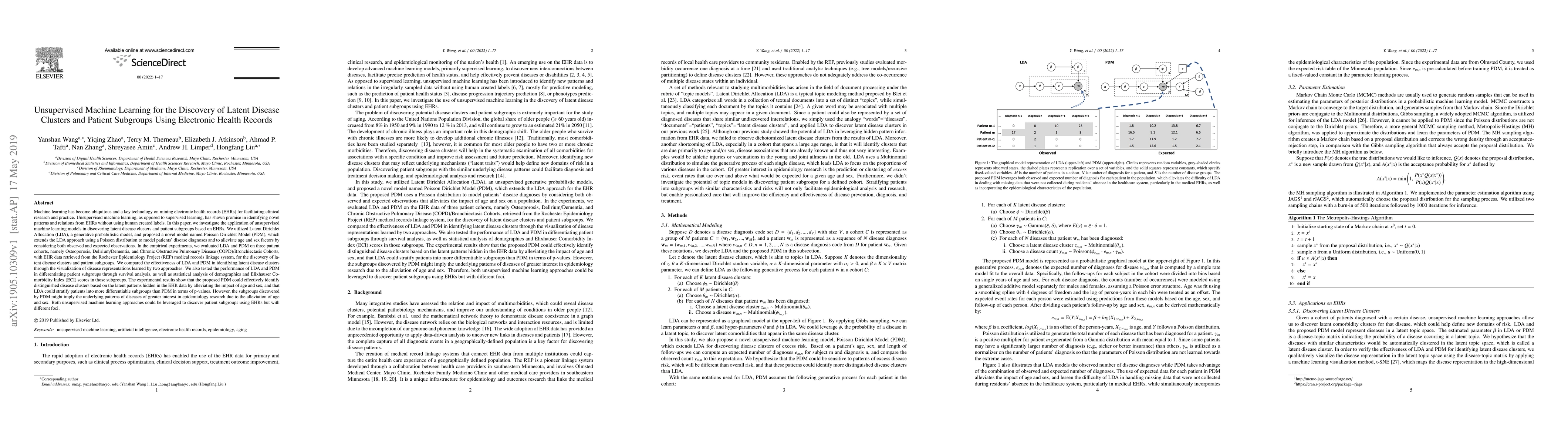 This paper explores unsupervised machine learning techniques, specifically Latent Dirichlet Allocation (LDA) and a novel Poisson Dirichlet Model (PDM), to identify latent disease clusters and patient subgroups from electronic health records (EHRs). The PDM extends LDA to better account for age and sex factors, demonstrating improved identification of disease clusters while LDA better differentiates patient subgroups statistically.