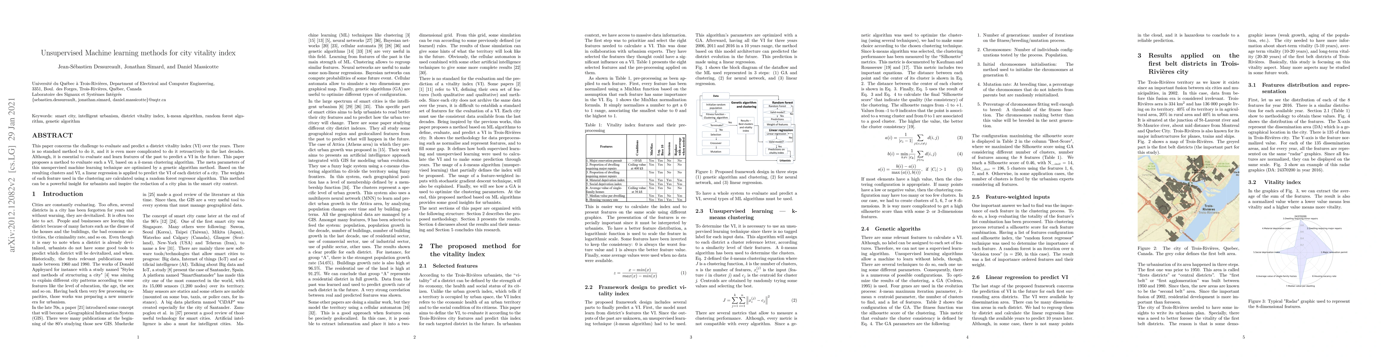 Researchers propose a method to evaluate city vitality index using unsupervised machine learning techniques, including k-mean clustering, genetic algorithm optimization, and random forest regressor analysis. The approach aims to provide insights for urban planners to create smart city plans.