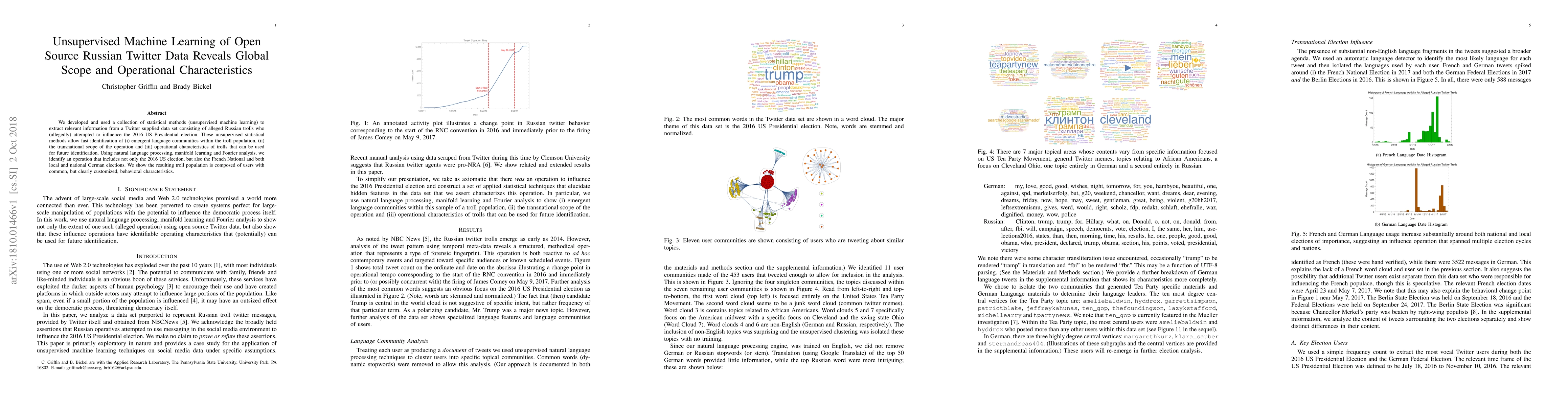 We developed and used a collection of statistical methods (unsupervised machine learning) to extract relevant information from a Twitter supplied data set consisting of alleged Russian trolls who (allegedly) attempted to influence the 2016 US Presidential election. These unsupervised statistical methods allow fast identification of (i) emergent language communities within the troll population, (ii) the transnational scope of the operation and (iii) operational characteristics of trolls that can be used for future identification. Using natural language processing, manifold learning and Fourier analysis, we identify an operation that includes not only the 2016 US election, but also the French National and both local and national German elections. We show the resulting troll population is composed of users with common, but clearly customized, behavioral characteristics.