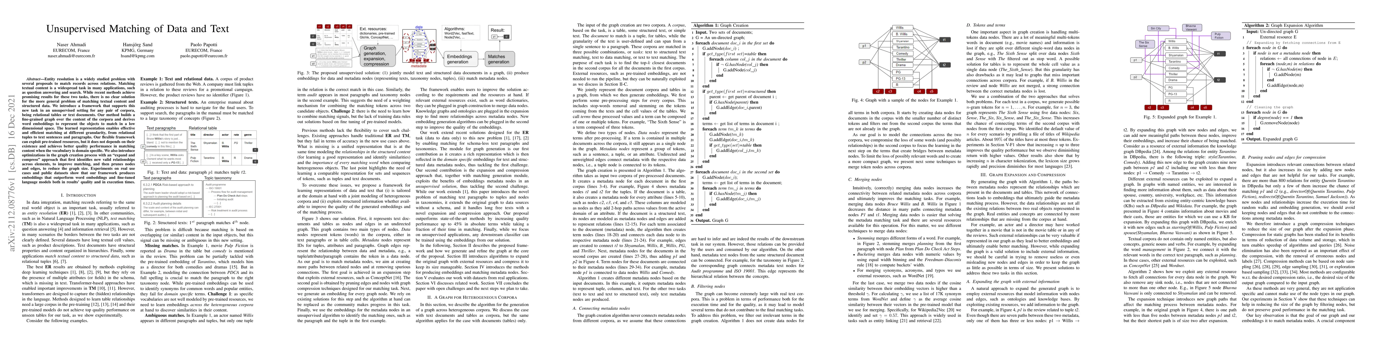 Entity resolution is a widely studied problem with several proposals to match records across relations. Matching textual content is a widespread task in many applications, such as question answering and search. While recent methods achieve promising results for these two tasks, there is no clear solution for the more general problem of matching textual content and structured data. We introduce a framework that supports this new task in an unsupervised setting for any pair of corpora, being relational tables or text documents. Our method builds a fine-grained graph over the content of the corpora and derives word embeddings to represent the objects to match in a low dimensional space. The learned representation enables effective and efficient matching at different granularity, from relational tuples to text sentences and paragraphs. Our flexible framework can exploit pre-trained resources, but it does not depends on their existence and achieves better quality performance in matching content when the vocabulary is domain specific. We also introduce optimizations in the graph creation process with an "expand and compress" approach that first identifies new valid relationships across elements, to improve matching, and then prunes nodes and edges, to reduce the graph size. Experiments on real use cases and public datasets show that our framework produces embeddings that outperform word embeddings and fine-tuned language models both in results' quality and in execution times.