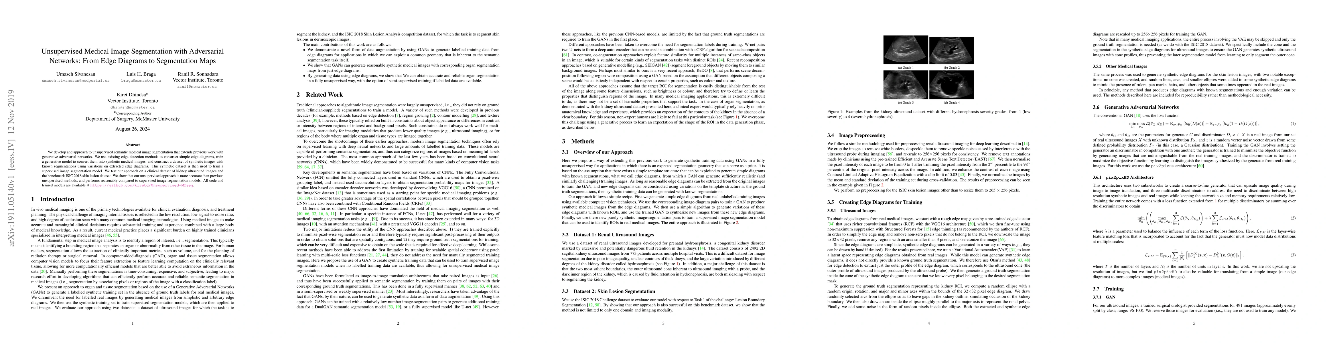 This paper proposes an unsupervised method for medical image segmentation using adversarial networks, leveraging edge diagrams to generate synthetic images with known segmentations, which are then used to train a supervised segmentation model. The approach is tested on kidney ultrasound and skin lesion datasets, demonstrating improved accuracy over previous unsupervised methods.