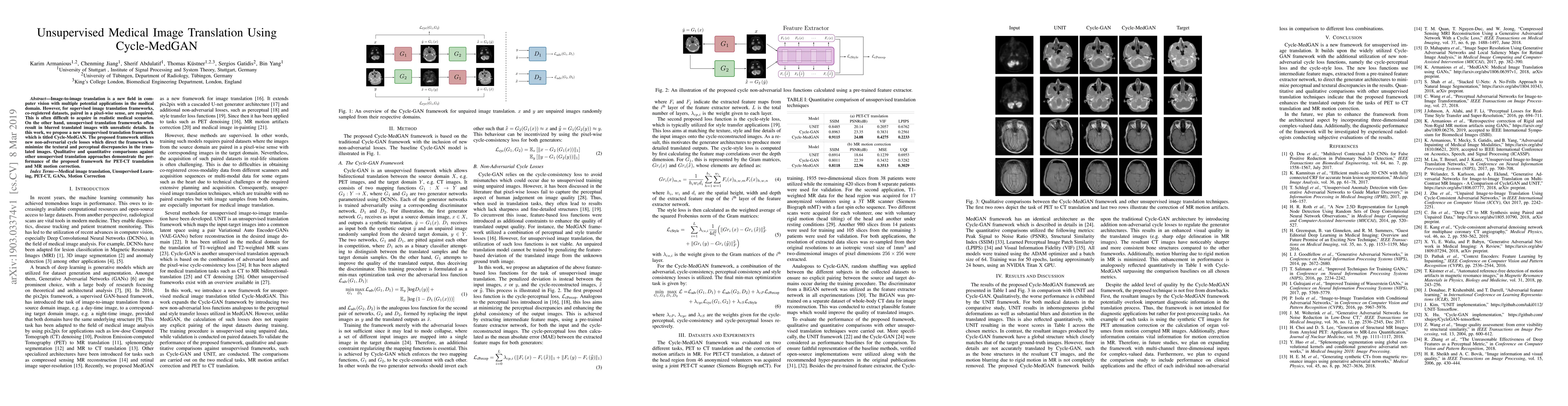 This paper introduces Cycle-MedGAN, an unsupervised medical image translation framework that employs non-adversarial cycle losses to reduce textural and perceptual discrepancies, achieving superior performance in PET-CT translation and MR motion correction compared to other unsupervised methods.