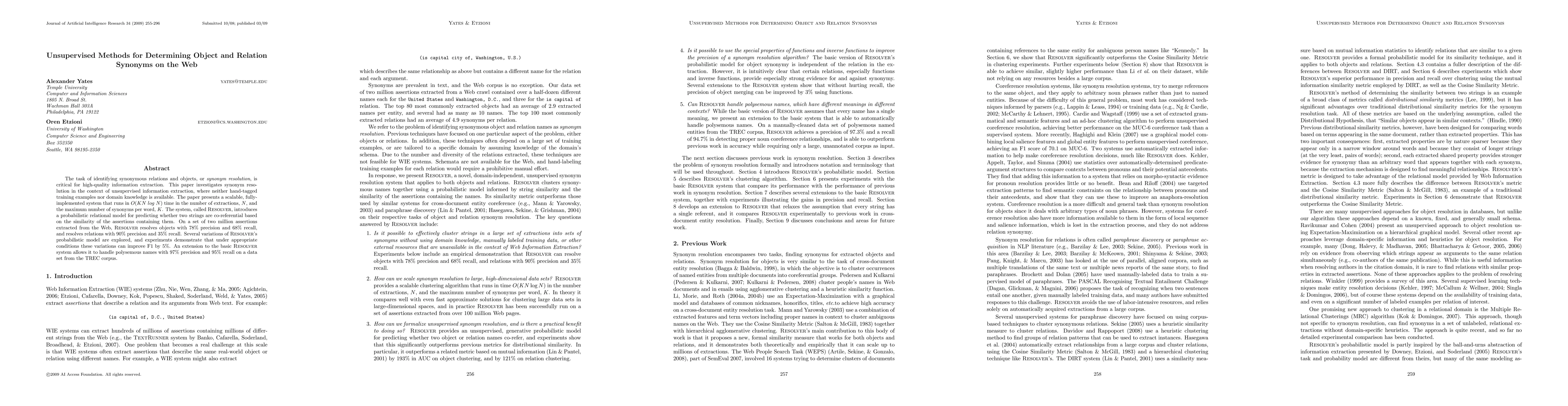 This paper introduces Resolver, an unsupervised system for identifying synonymous objects and relations on the web, achieving 78% precision and 68% recall for object synonyms, and 90% precision and 35% recall for relation synonyms. The system operates in O(KN log N) time, and variations of its probabilistic relational model can enhance F1 by 5%. Resolver also effectively handles polysemous names with high precision and recall.