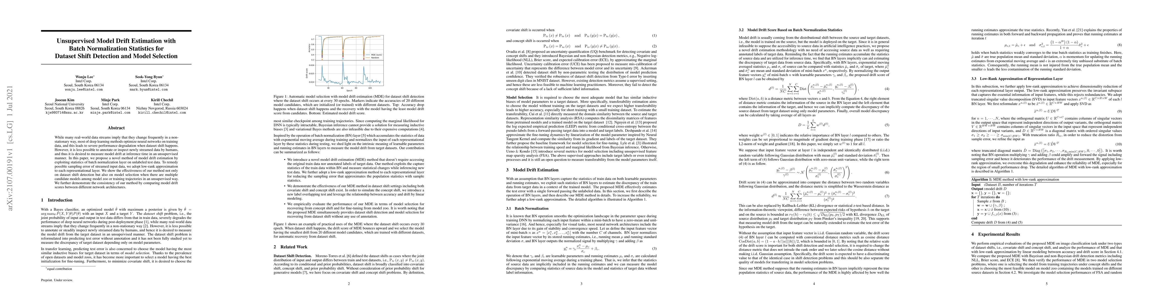 This paper proposes a novel method for unsupervised model drift estimation using batch normalization statistics to detect dataset shift and select the best model. It effectively handles non-stationary data changes without human annotation or inspection.
