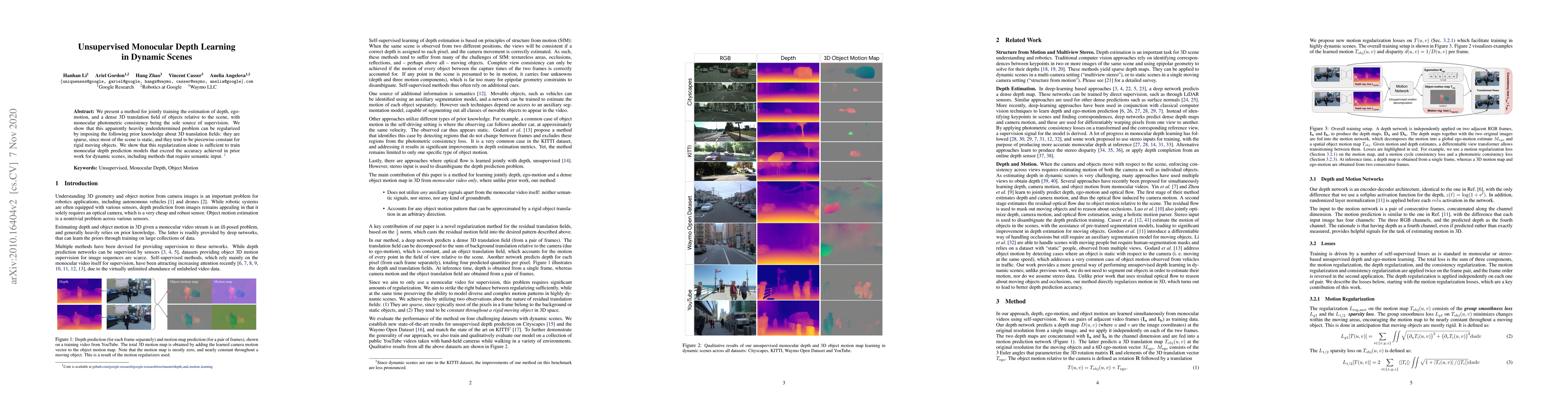 This paper proposes a method for unsupervised monocular depth estimation in dynamic scenes by leveraging photometric consistency and prior knowledge of sparse 3D translation fields. The approach achieves superior accuracy compared to previous methods, even those that use semantic inputs.