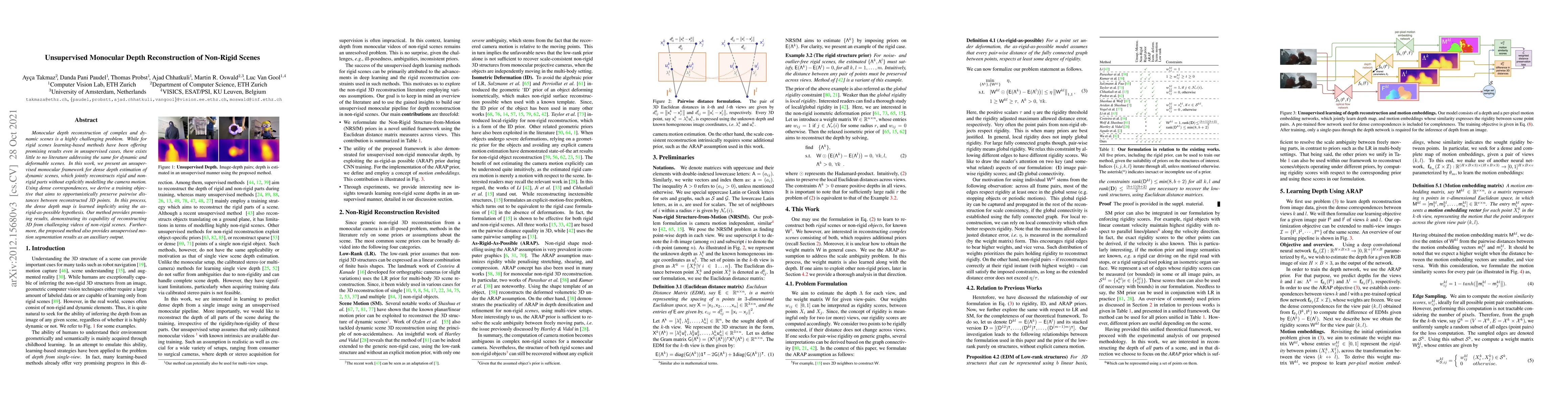 This paper introduces an unsupervised monocular framework for reconstructing dense depth maps of dynamic, non-rigid scenes, using dense correspondences to preserve pairwise distances and implicitly learning depth via the as-rigid-as-possible hypothesis, yielding promising results for complex scene reconstructions. The method also offers unsupervised motion segmentation as an additional output.