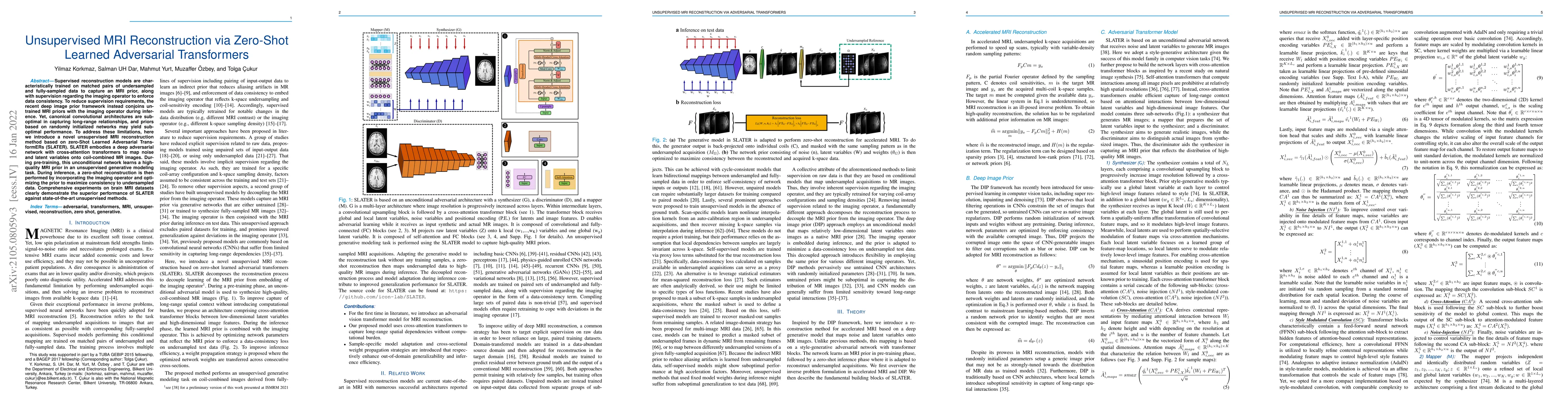 This paper introduces an unsupervised MRI reconstruction method using zero-Shot Learned Adversarial TransformERs (SLATER), which leverages a deep adversarial network with transformers to capture long-range relationships, achieving superior performance compared to state-of-the-art unsupervised methods. SLATER pre-trains the network in an unsupervised generative modeling task to learn a high-quality MRI prior, which is then optimized during inference for undersampled data reconstruction.