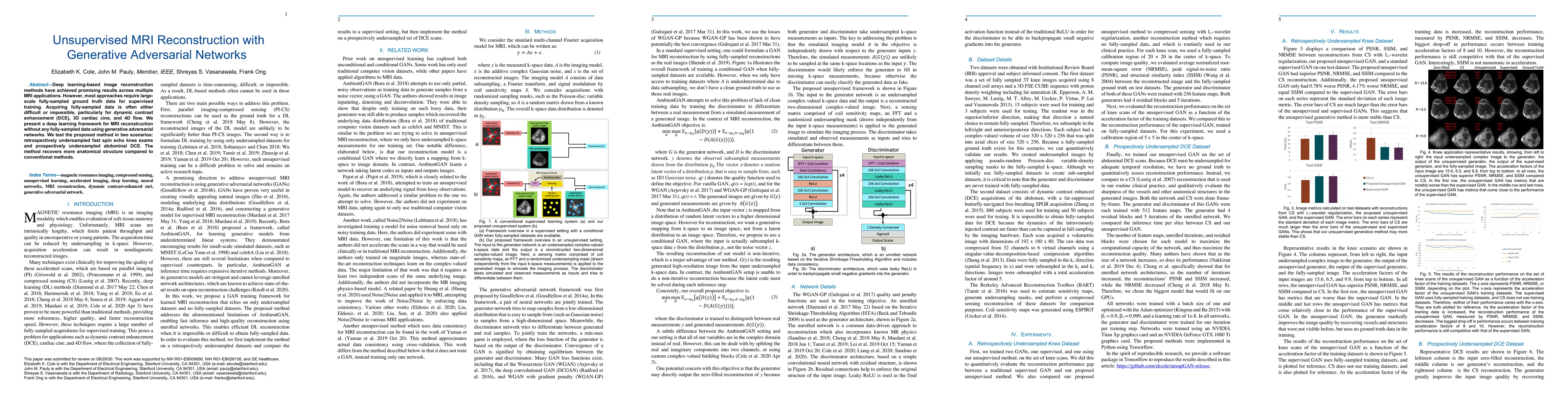 This paper proposes an unsupervised MRI reconstruction method using generative adversarial networks (GANs) that does not require fully-sampled ground truth data, enabling its application to scenarios like dynamic contrast enhancement (DCE) where such data is hard to obtain. The method outperforms conventional techniques in reconstructing anatomical structures in knee exams and abdominal DCE.