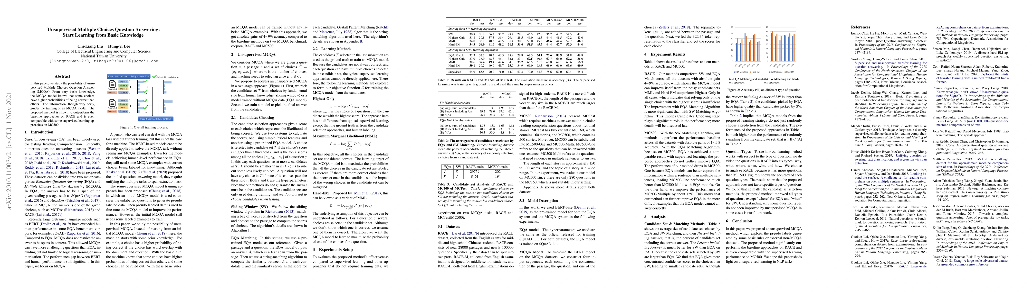 This paper explores an unsupervised approach to Multiple Choices Question Answering (MCQA) that leverages basic knowledge to guide the training process, achieving better performance on the RACE and MC500 datasets compared to baseline methods and sometimes rivaling supervised learning approaches.