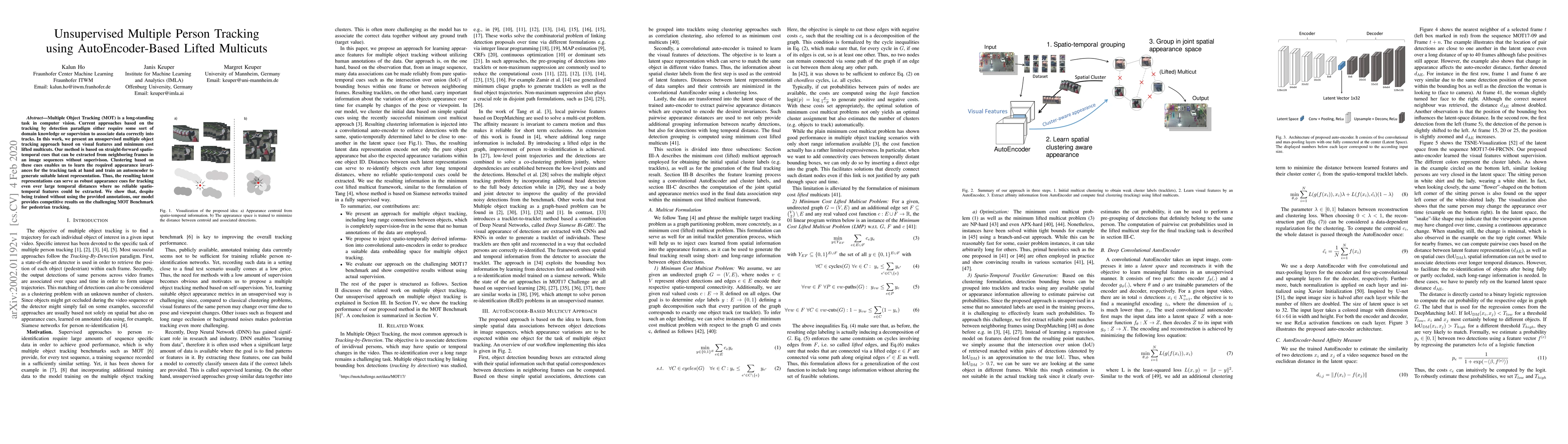 This paper presents an unsupervised method for multiple object tracking using autoencoder-based lifted multicuts, relying on visual features and spatio-temporal cues extracted from image sequences without supervision. The approach demonstrates competitive performance on pedestrian tracking benchmarks despite the lack of training annotations.