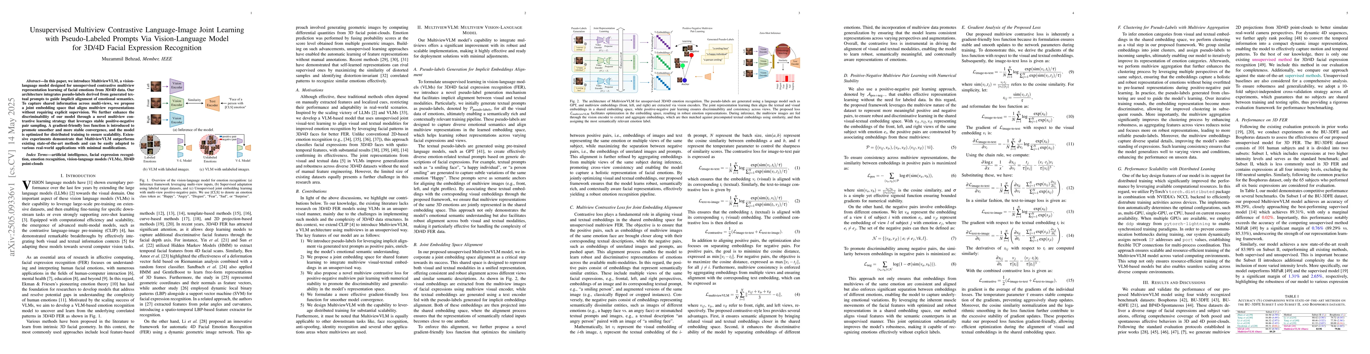 The research introduces MultiviewVLM, a vision-language model for unsupervised contrastive multiview representation learning of facial emotions from 3D/4D data, integrating pseudo-labels from generated textual prompts and a joint embedding space for alignment, enhanced by a novel multiview contrastive learning strategy and a gradient-friendly loss function, optimized for distributed training.
