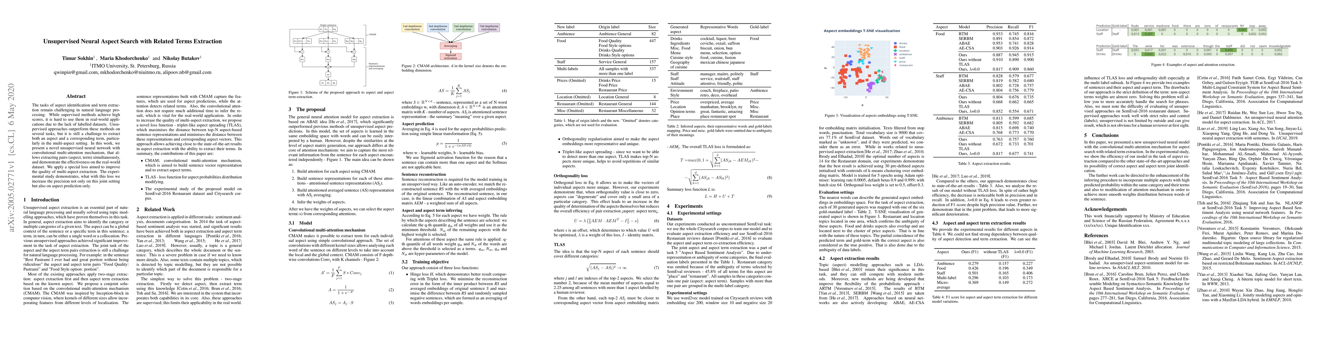The tasks of aspect identification and term extraction remain challenging in natural language processing. While supervised methods achieve high scores, it is hard to use them in real-world applications due to the lack of labelled datasets. Unsupervised approaches outperform these methods on several tasks, but it is still a challenge to extract both an aspect and a corresponding term, particularly in the multi-aspect setting. In this work, we present a novel unsupervised neural network with convolutional multi-attention mechanism, that allows extracting pairs (aspect, term) simultaneously, and demonstrate the effectiveness on the real-world dataset. We apply a special loss aimed to improve the quality of multi-aspect extraction. The experimental study demonstrates, what with this loss we increase the precision not only on this joint setting but also on aspect prediction only.