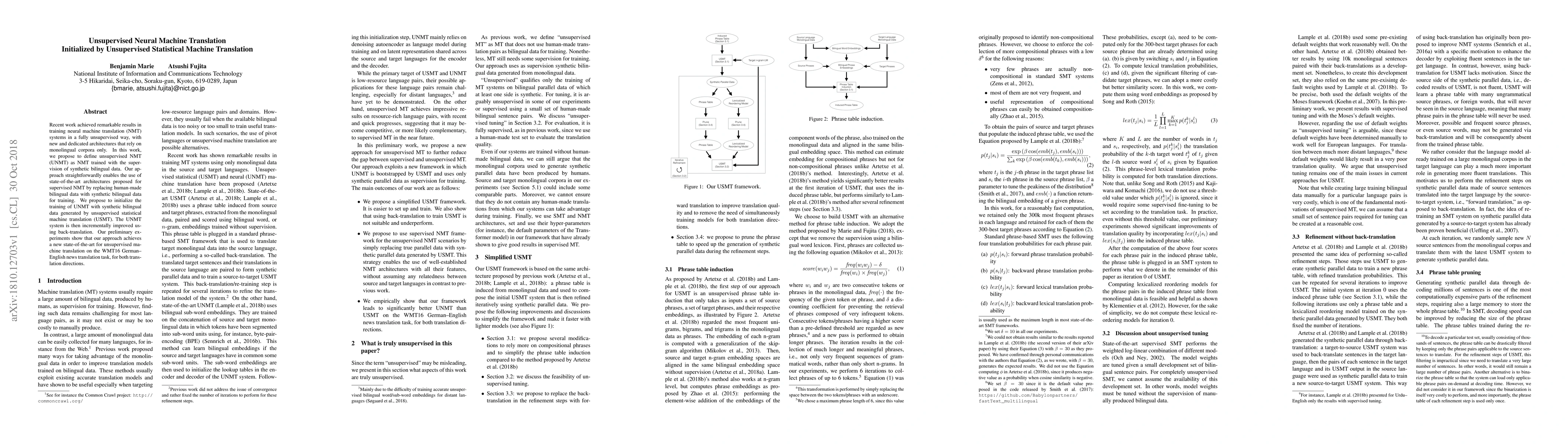 This paper proposes an unsupervised neural machine translation (UNMT) system initialized with synthetic bilingual data generated by unsupervised statistical machine translation (USMT) and refined using back-translation. Preliminary results indicate state-of-the-art performance on the WMT16 German-English translation task.