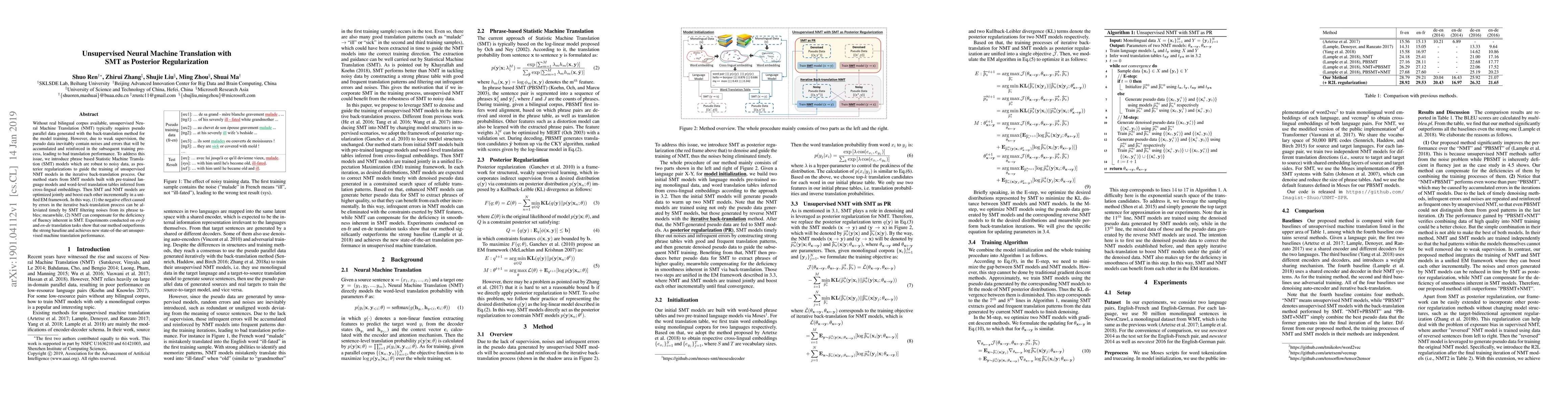 This paper proposes an unsupervised Neural Machine Translation (NMT) method that uses phrase-based Statistical Machine Translation (SMT) as posterior regularization to mitigate noise in pseudo parallel data generated via back-translation. The joint optimization of SMT and NMT models in an EM framework enhances both translation quality and fluency.