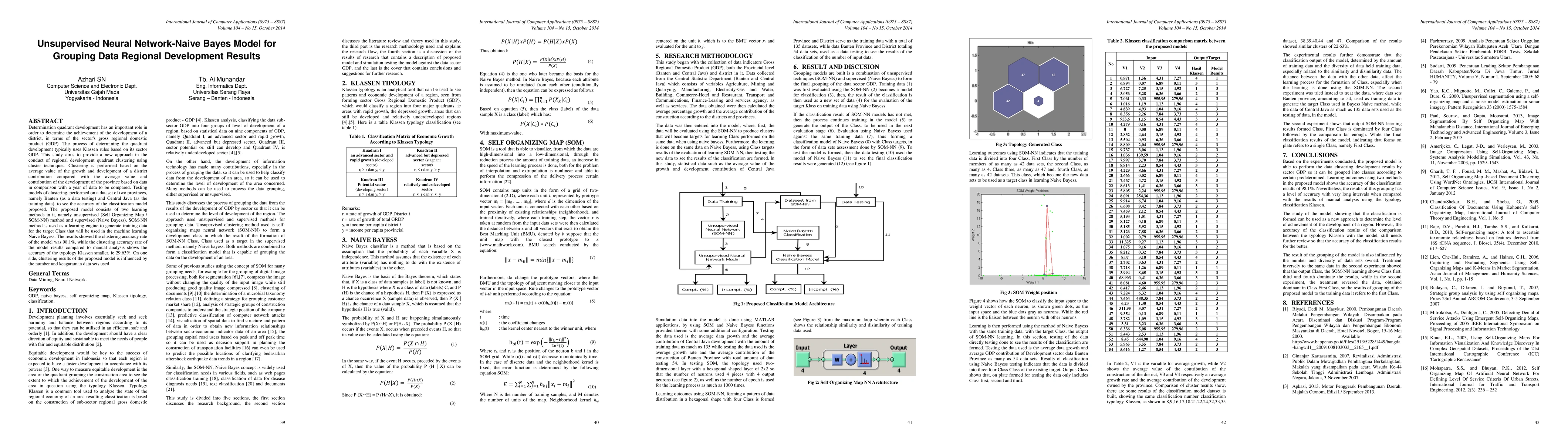 Determination quadrant development has an important role in order to determine the achievement of the development of a district, in terms of the sector's gross regional domestic product (GDP). The process of determining the quadrant development typically uses Klassen rules based on its sector GDP. This study aims to provide a new approach in the conduct of regional development quadrant clustering using cluster techniques. Clustering is performed based on the average value of the growth and development of a district contribution compared with the average value and contribution of the development of the province based on data in comparison with a year of data to be compared. Testing models of clustering, performed on a dataset of two provinces, namely Banten (as a data testing) and Central Java (as the training data), to see the accuracy of the classification model proposed. The proposed model consists of two learning methods in it, namely unsupervised (Self Organizing Map / SOM-NN) method and supervised (Naive Bayess). SOM-NN method is used as a learning engine to generate training data for the target Class that will be used in the machine learning Naive Bayess. The results showed the clustering accuracy rate of the model was 98.1%, while the clustering accuracy rate of the model results compared to manual analysis shows the accuracy of the typology Klassen smaller, ie 29.63%. On one side, clustering results of the proposed model is influenced by the number and keagaraman data sets used.