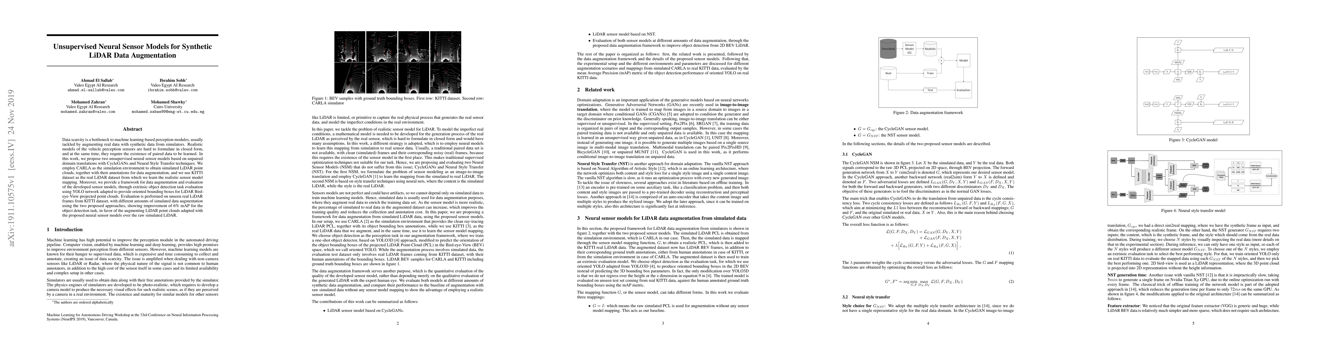 This paper proposes unsupervised neural sensor models using CycleGANs and Neural Style Transfer for augmenting real LiDAR data with synthetic LiDAR data from CARLA simulations. The approach improves object detection performance by 6% mAP, demonstrating the effectiveness of the synthetic data augmentation over raw simulated data.