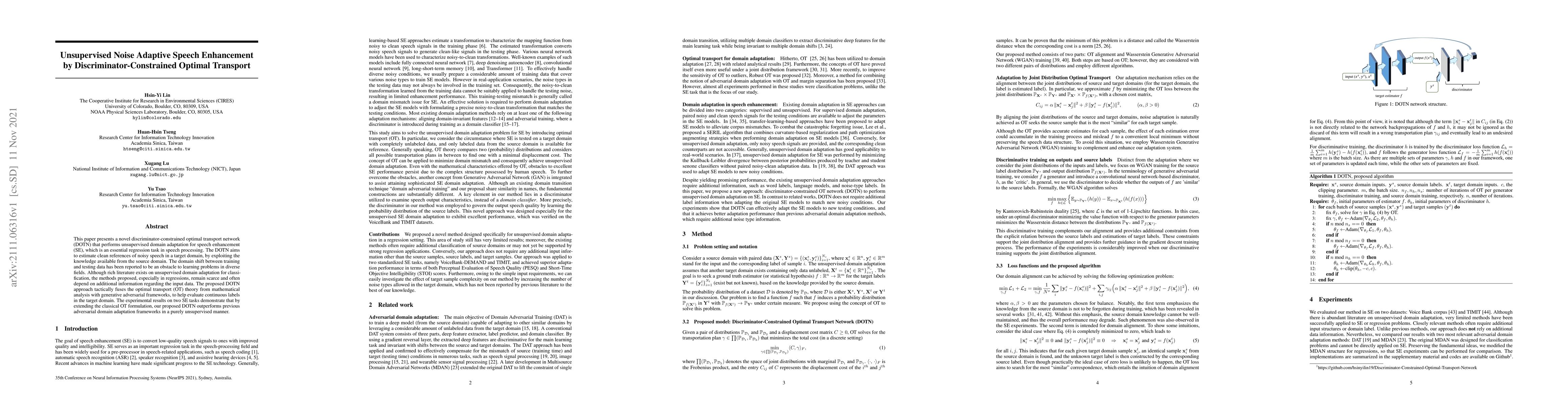 This paper introduces a discriminator-constrained optimal transport network (DOTN) for unsupervised speech enhancement, leveraging optimal transport theory and generative adversarial frameworks to adapt from a source domain to a target domain without labeled data. Experimental results show that the proposed DOTN outperforms existing methods in unsupervised domain adaptation for regression tasks.