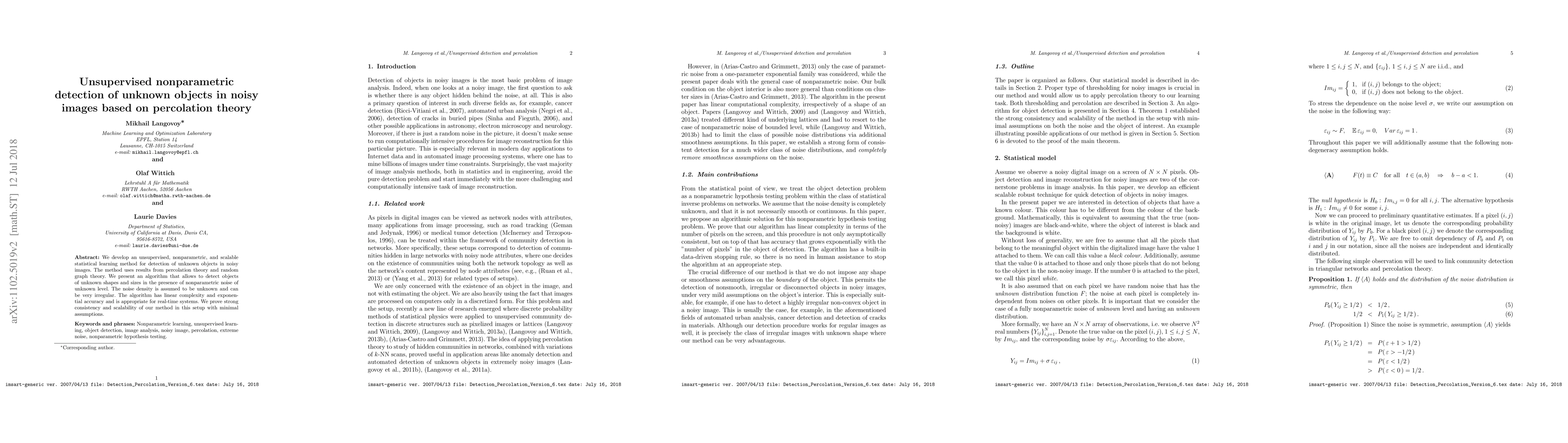 We develop an unsupervised, nonparametric, and scalable statistical learning method for detection of unknown objects in noisy images. The method uses results from percolation theory and random graph theory. We present an algorithm that allows to detect objects of unknown shapes and sizes in the presence of nonparametric noise of unknown level. The noise density is assumed to be unknown and can be very irregular. The algorithm has linear complexity and exponential accuracy and is appropriate for real-time systems. We prove strong consistency and scalability of our method in this setup with minimal assumptions.