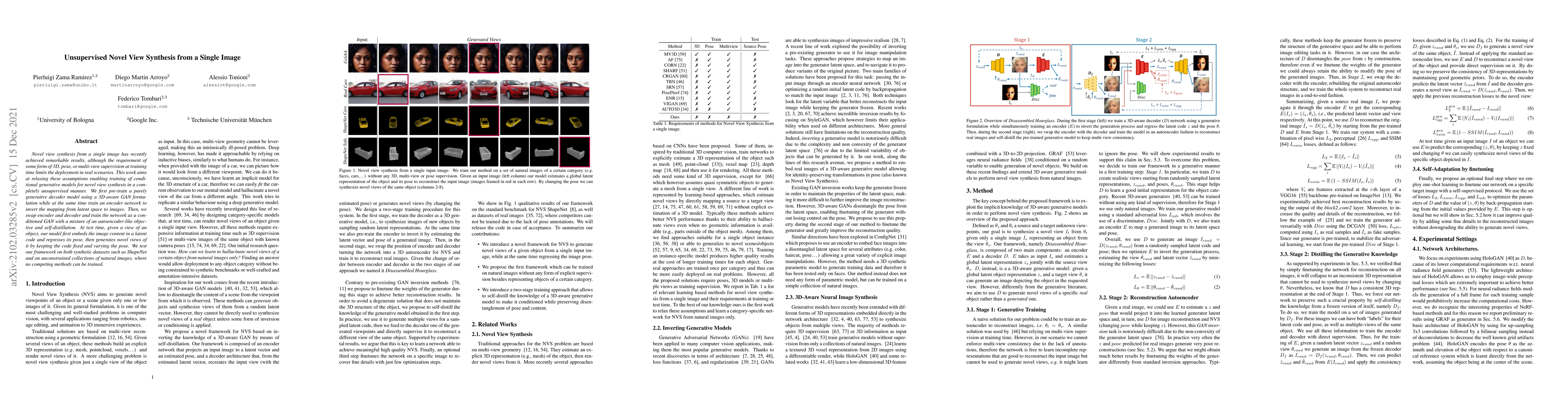 This paper proposes an unsupervised method for novel view synthesis from a single image, training a generative model without requiring 3D, pose, or multi-view supervision. It uses a 3D-aware GAN and self-distillation to generate novel views by embedding image content in a latent code and varying the pose.