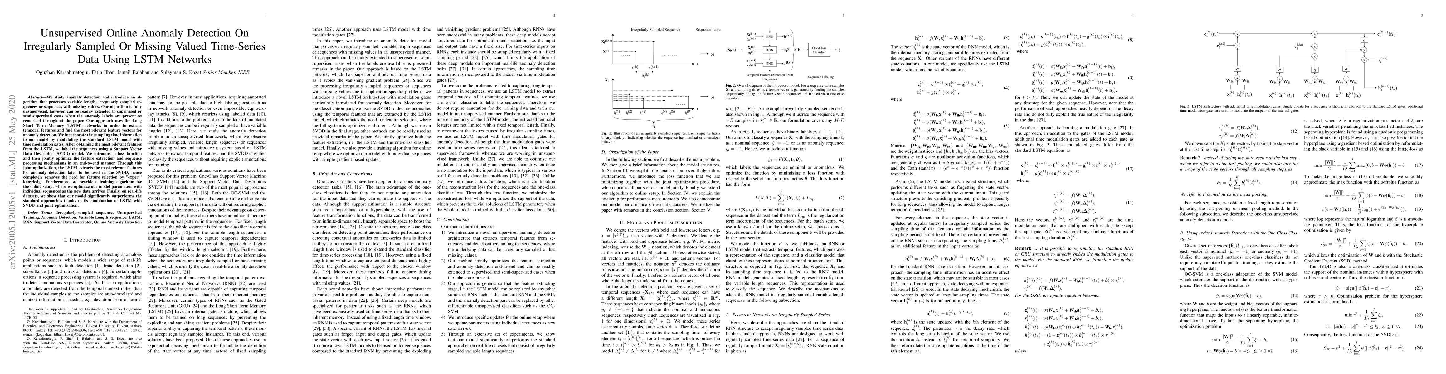 This paper proposes an unsupervised online anomaly detection algorithm for irregularly sampled or missing time-series data using LSTM networks. The method integrates time modulation gates and jointly optimizes feature extraction and sequence processing, outperforming standard approaches on real-life datasets.