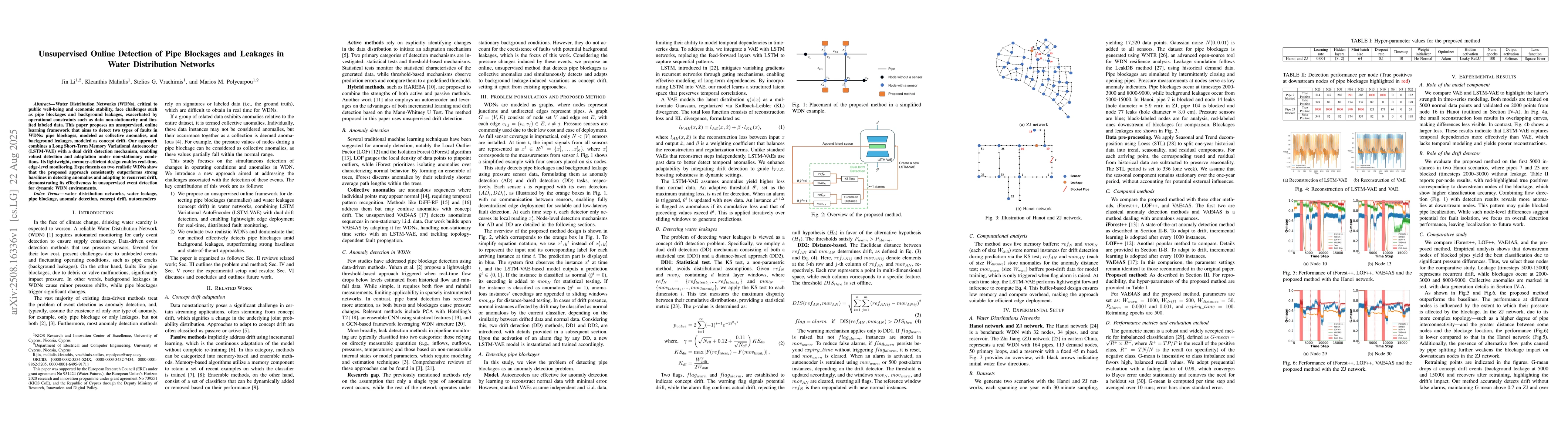 Water Distribution Networks (WDNs), critical to public well-being and economic stability, face challenges such as pipe blockages and background leakages, exacerbated by operational constraints such as data non-stationarity and limited labeled data. This paper proposes an unsupervised, online learning framework that aims to detect two types of faults in WDNs: pipe blockages, modeled as collective anomalies, and background leakages, modeled as concept drift. Our approach combines a Long Short-Term Memory Variational Autoencoder (LSTM-VAE) with a dual drift detection mechanism, enabling robust detection and adaptation under non-stationary conditions. Its lightweight, memory-efficient design enables real-time, edge-level monitoring. Experiments on two realistic WDNs show that the proposed approach consistently outperforms strong baselines in detecting anomalies and adapting to recurrent drift, demonstrating its effectiveness in unsupervised event detection for dynamic WDN environments.