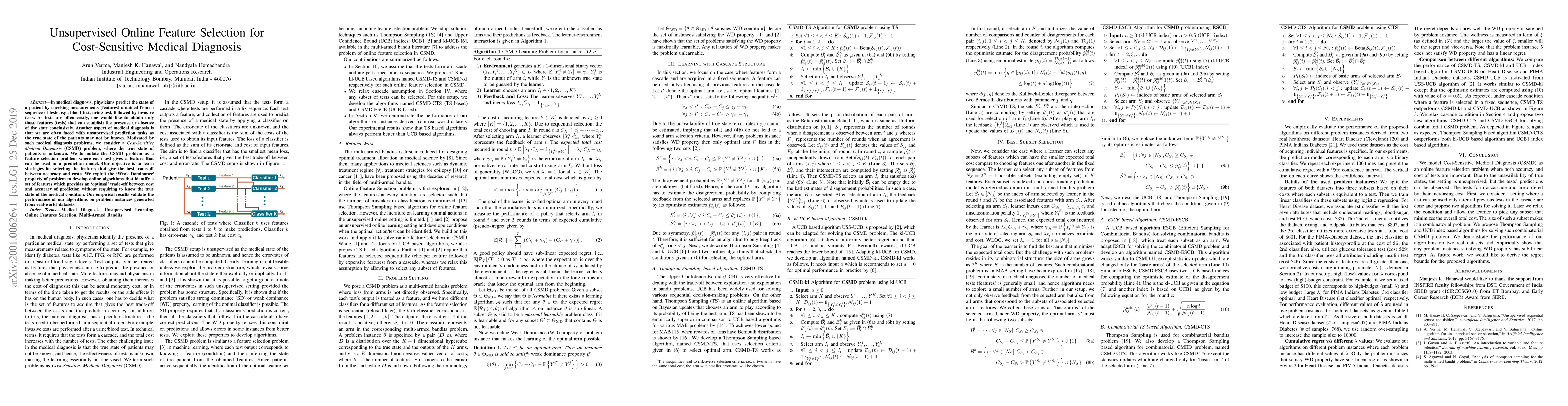 This paper proposes unsupervised online algorithms for feature selection in cost-sensitive medical diagnosis, aiming to identify the most effective tests that balance accuracy and cost without needing the true patient condition. The approach leverages the "Weak Dominance" property to achieve optimal trade-offs.