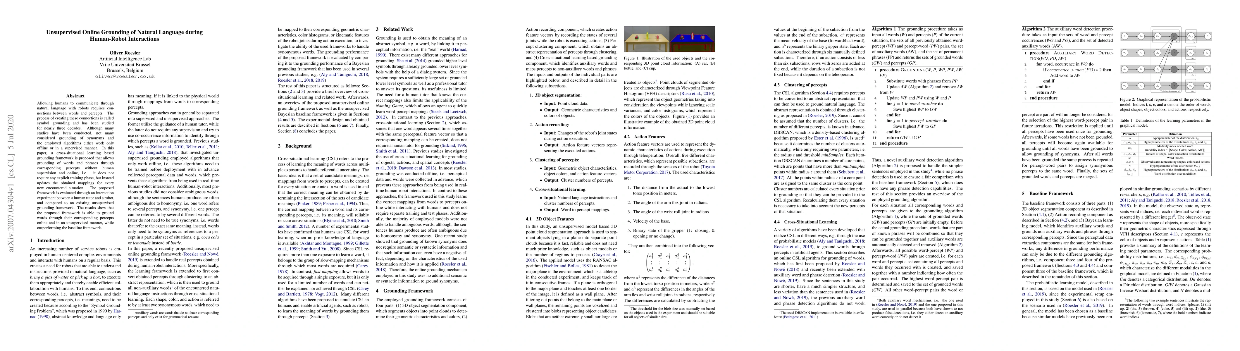 The paper presents a novel unsupervised online grounding framework for natural language in human-robot interactions, utilizing cross-situational learning without requiring explicit training.