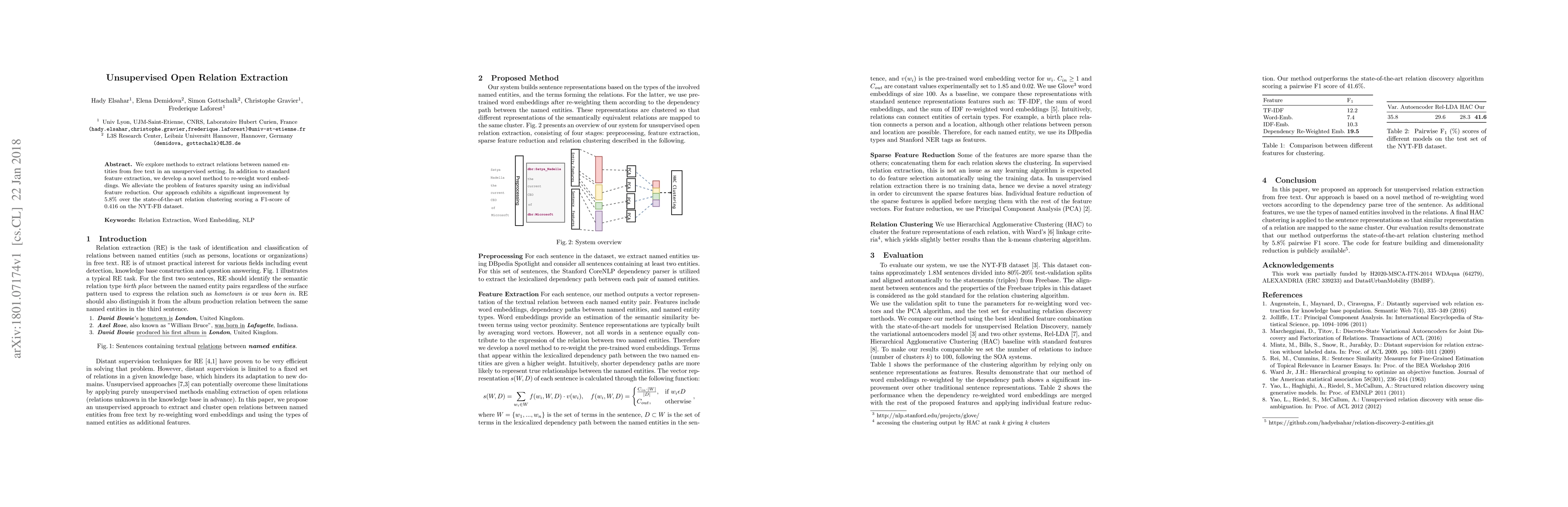 This paper proposes an unsupervised method for open relation extraction from text, enhancing word embeddings through a novel re-weighting technique and feature reduction to tackle sparsity, achieving a 5.8% improvement over the state-of-the-art with a F1-score of 0.416 on the NYT-FB dataset.