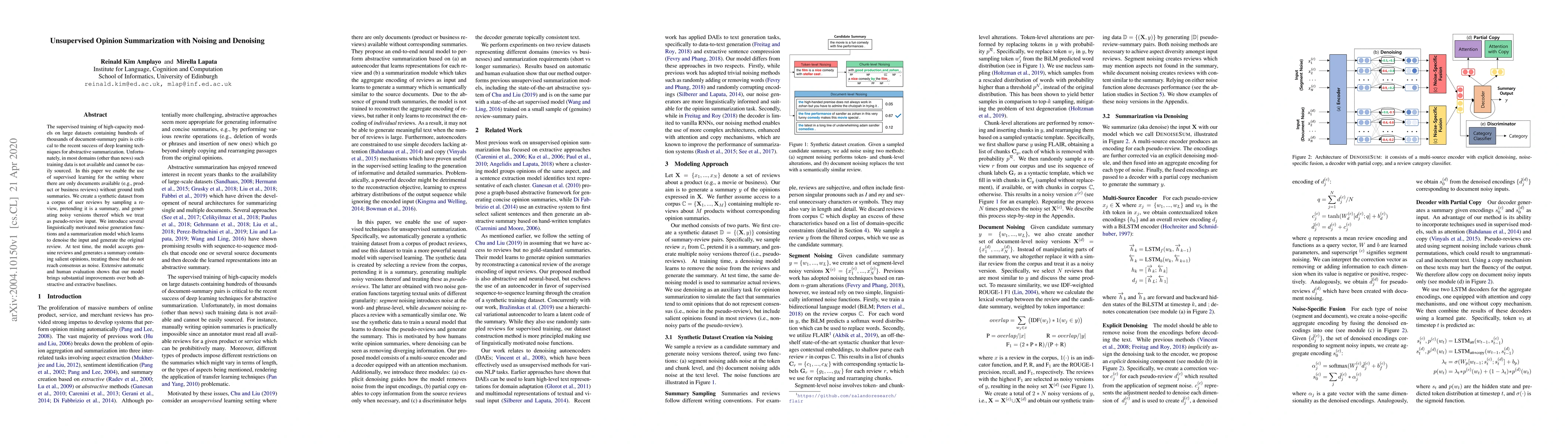 The supervised training of high-capacity models on large datasets containing hundreds of thousands of document-summary pairs is critical to the recent success of deep learning techniques for abstractive summarization. Unfortunately, in most domains (other than news) such training data is not available and cannot be easily sourced. In this paper we enable the use of supervised learning for the setting where there are only documents available (e.g.,~product or business reviews) without ground truth summaries. We create a synthetic dataset from a corpus of user reviews by sampling a review, pretending it is a summary, and generating noisy versions thereof which we treat as pseudo-review input. We introduce several linguistically motivated noise generation functions and a summarization model which learns to denoise the input and generate the original review. At test time, the model accepts genuine reviews and generates a summary containing salient opinions, treating those that do not reach consensus as noise. Extensive automatic and human evaluation shows that our model brings substantial improvements over both abstractive and extractive baselines.
