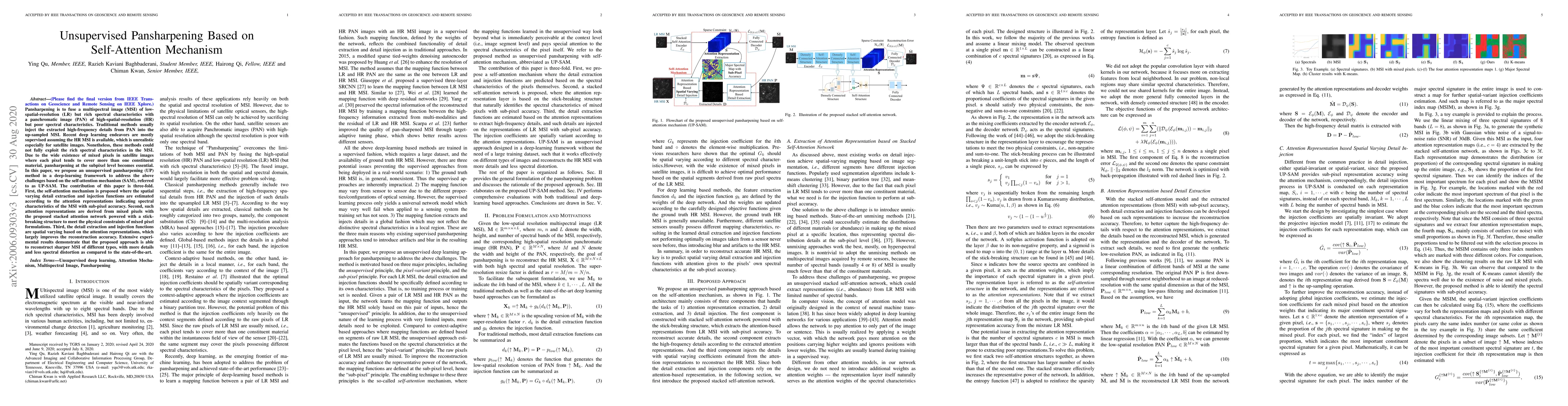 This paper proposes an unsupervised pansharpening method, UP-SAM, based on a self-attention mechanism to fuse low-spatial-resolution multispectral images with high-spatial-resolution panchromatic images. The method extracts spatial-varying details and injects them into the multispectral image, achieving sharper reconstructions with less spectral distortion compared to state-of-the-art techniques.