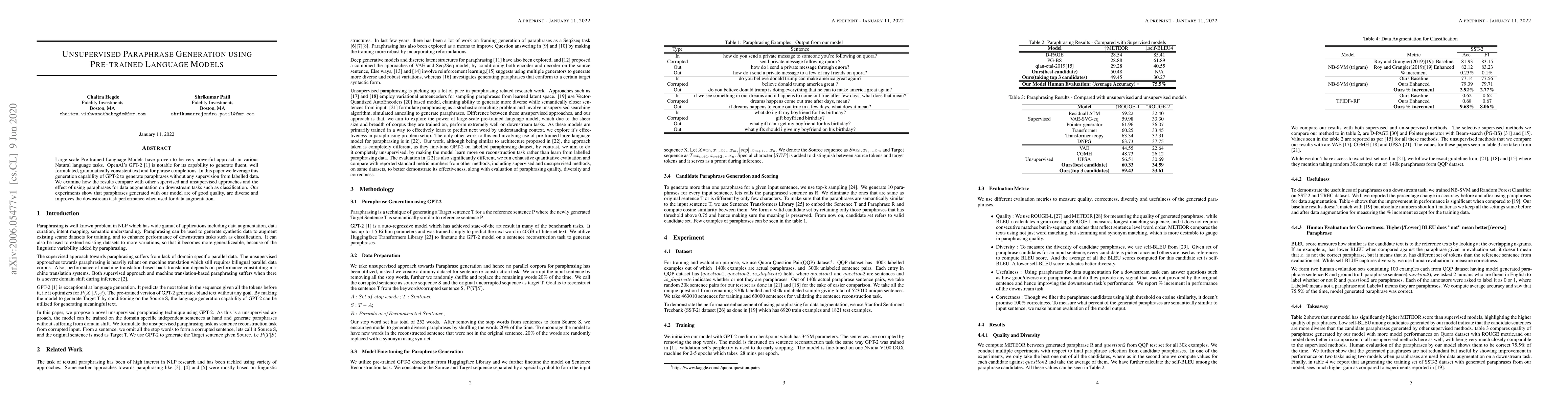 Large scale Pre-trained Language Models have proven to be very powerful approach in various Natural language tasks. OpenAI's GPT-2 \cite{radford2019language} is notable for its capability to generate fluent, well formulated, grammatically consistent text and for phrase completions. In this paper we leverage this generation capability of GPT-2 to generate paraphrases without any supervision from labelled data. We examine how the results compare with other supervised and unsupervised approaches and the effect of using paraphrases for data augmentation on downstream tasks such as classification. Our experiments show that paraphrases generated with our model are of good quality, are diverse and improves the downstream task performance when used for data augmentation.